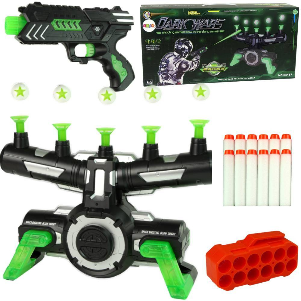 - Zabawa pozwalająca rozwinąć koncentrację i ocenę odległości. W zestawie znajduje się tarcza w kształcie świecznika, pistolet, magazynek i naboje. Zabawa polega na ustrzeleniu piłeczki, która unosi się w powietrzu.