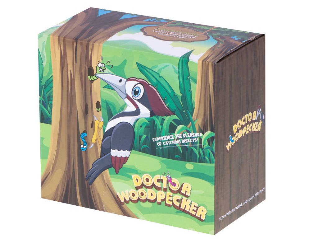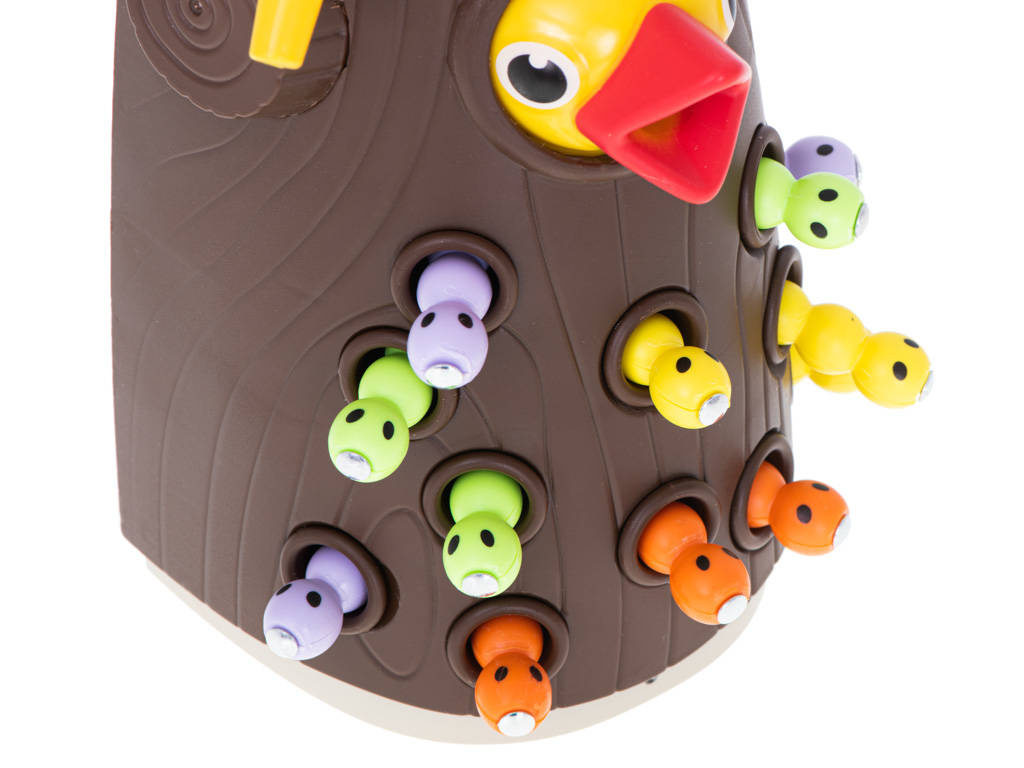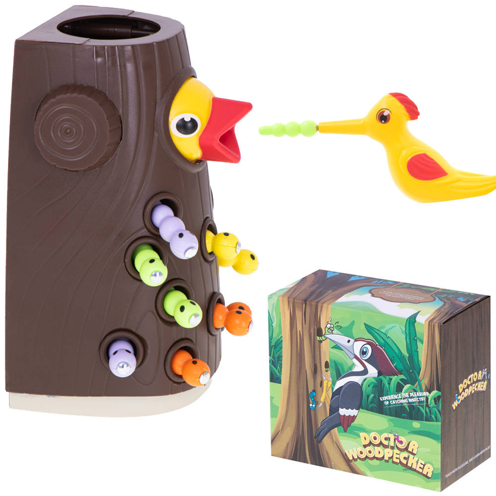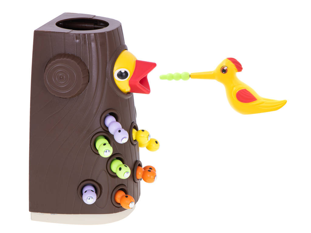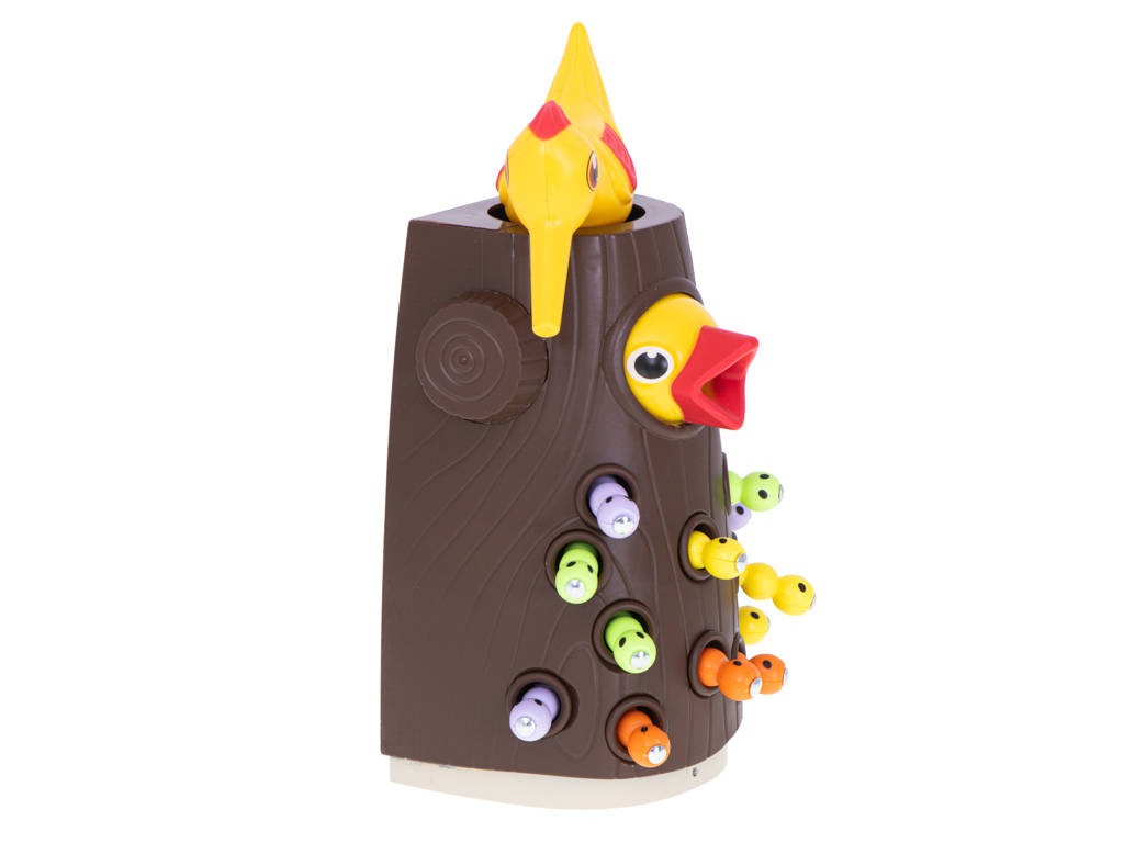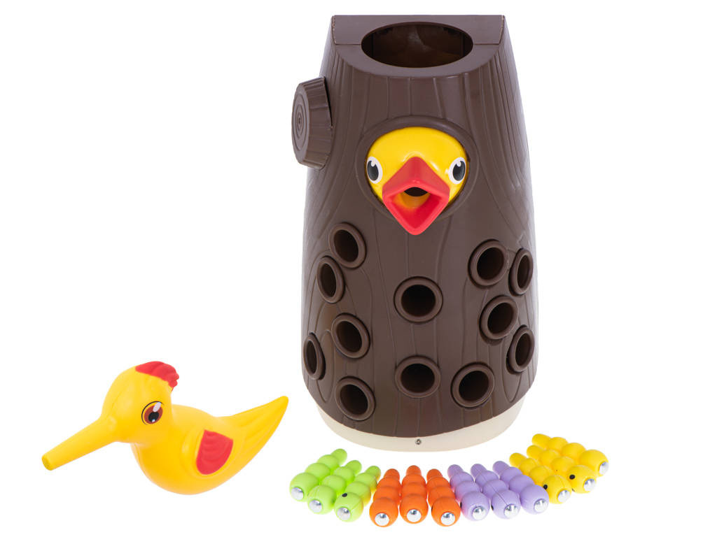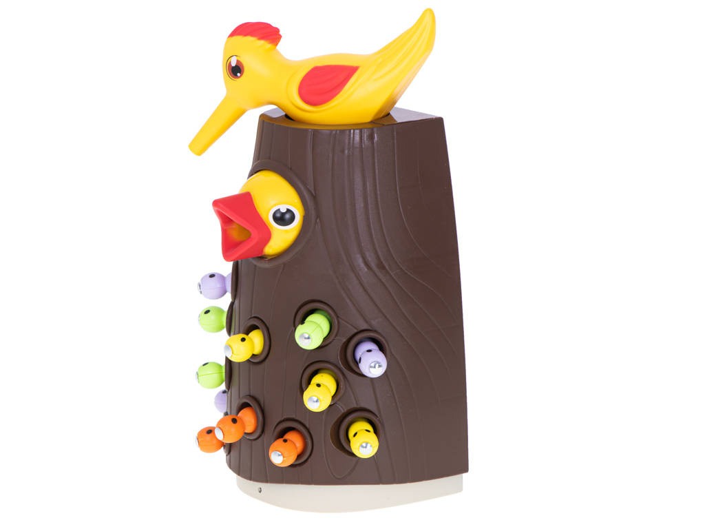 Doktor dzięcioł leci na ratunek! Pomóż dzięciołowi powyciągać robaczki z chorego drzewa a potem nakarm nimi głodnego pisklaka. Robaczki umieszczone w pniu drzewa mają metalowe główki dzięki czemu można je złapać za pomocą ptaszka którego dziobek wyposażony jest w magnes. Nie jest to proste zadanie i wymaga dużego skupienia i precyzji ruchów. Do złapania masz 12 robaczków. Jednak po kilku próbach nie powinno to już sprawiać dziecku zbytniej trudności.DOKTOR DZIĘCIOŁ MAGNETYCZNA GRA ZRĘCZNOŚCIOWA