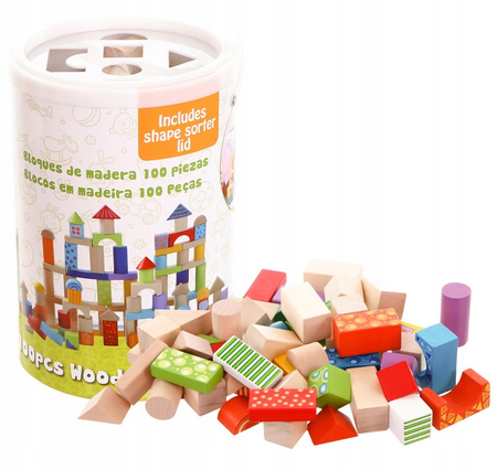 - Zestaw 100 drewnianych klocków do układania dla dzieci. Klocki są zapakowane w specjalnym wiaderku, na wierzchu którego znajduje się sorter, który dodatkowo urozmaica zabawę. Dla dzieci od 18 miesiąca życia.