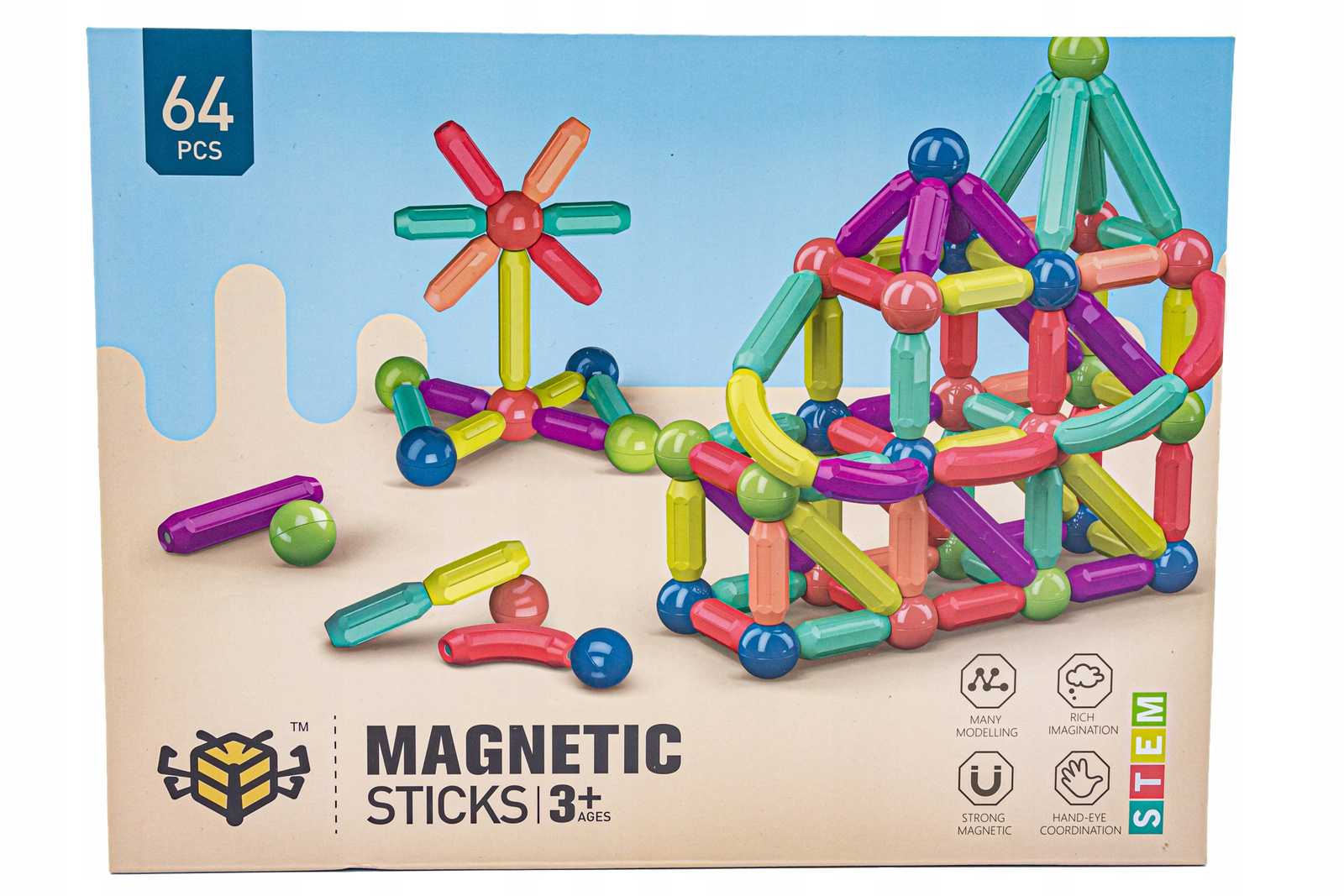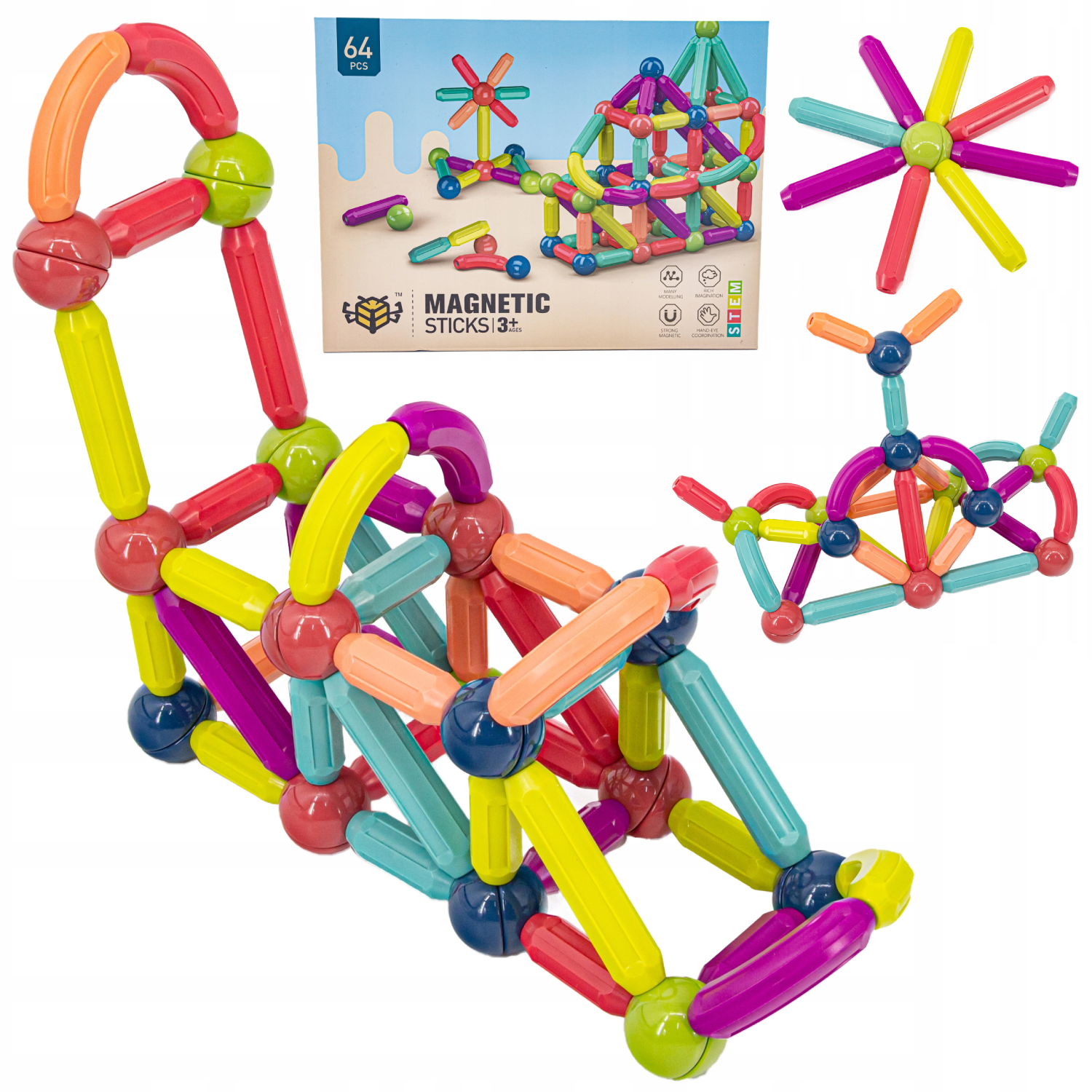 Klocki konstrukcyjne Magnetyczne Zestaw dla dzieci Kolorowe patyczki 64 elementy