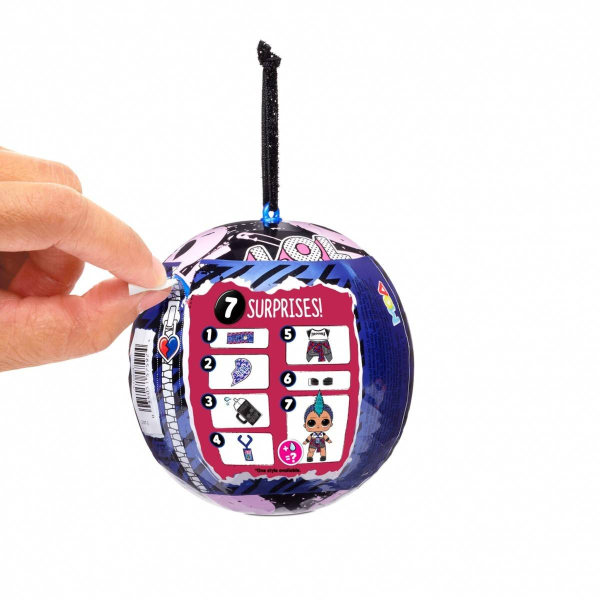 - W środku tajemniczej kuli znajdziesz niebieską piękną laleczkę chłopca L.O.L. Surprise! Punk Boi. Wraz z nim odkryjesz 7 różnych niespodzianek .