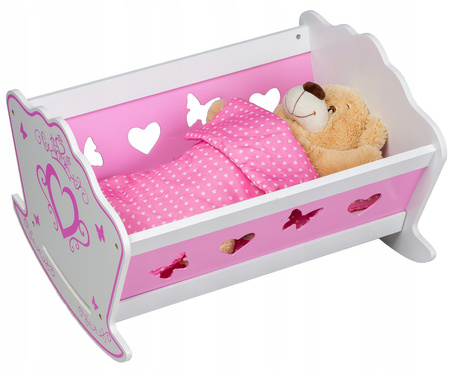 - Drewniana kołyska, łóżeczko dla lalek w kolorze różowym, idealny prezent dla małej dziewczynki uwielbiającej opiekować się swoimi lalkami. Dla dzieci od lat 3.