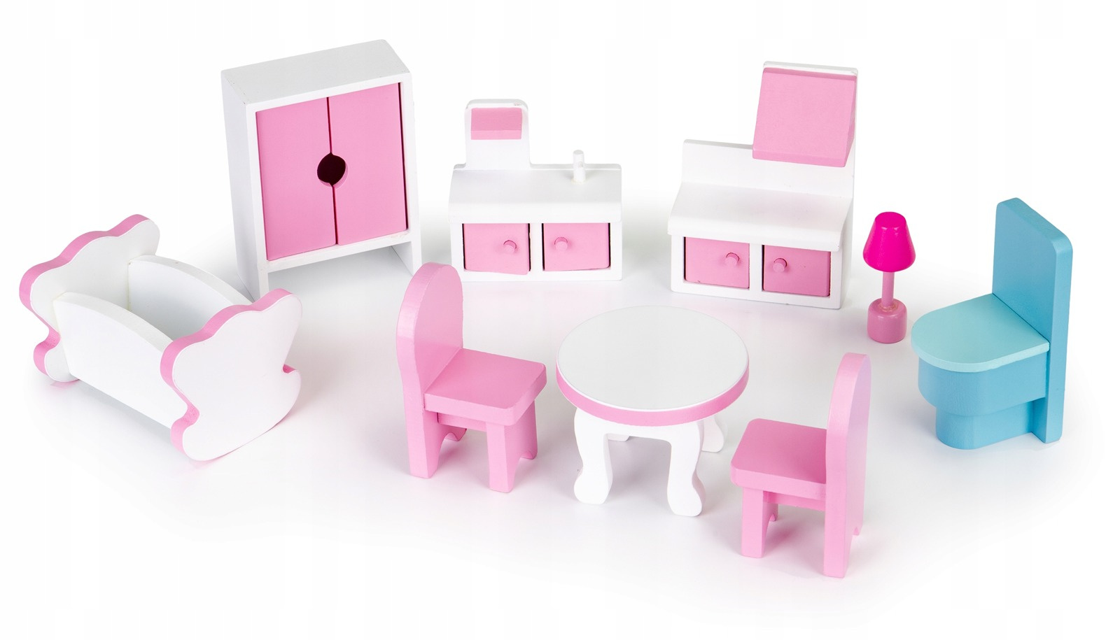 - komplet 9 drewnianych mebli: stół i 2 krzesła, dwie szafki kuchenne, toaleta, łóżko, szafa, lampka