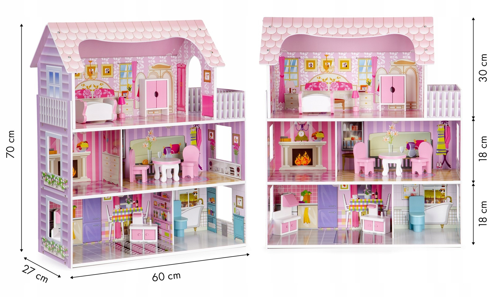 Duży, drewniany domek dla lalek to gwarancją świetnej zabawy. Posiada trzy, w pełni umeblowane piętra, które tworzą całkowicie funkcjonalny dom, gotowy, by mogły w nim zamieszkać lalki twojej córki. Wyposażony z kuchnie, łazienkę, salon, pokój sypialny, pomieszczenie z kominkiem i balkon oraz dołączone do zestawu mebelków to również pole do popisu umiejętnościami dekorowania wnętrz. Dodatkowo jest oświetlony światełkami LED, które dają niesamowity efekt WOW, a jego duże wymiary i wyprofilowany dach ułatwią wspólną zabawę i pozwolą zbudować więzi przyjaźni, które zostaną z dziećmi na długie lata. Zabawka jest też zupełnie bezpieczna, nie posiada drobnych elementów, ani ostrych krawędzi.W ZESTAWIE: