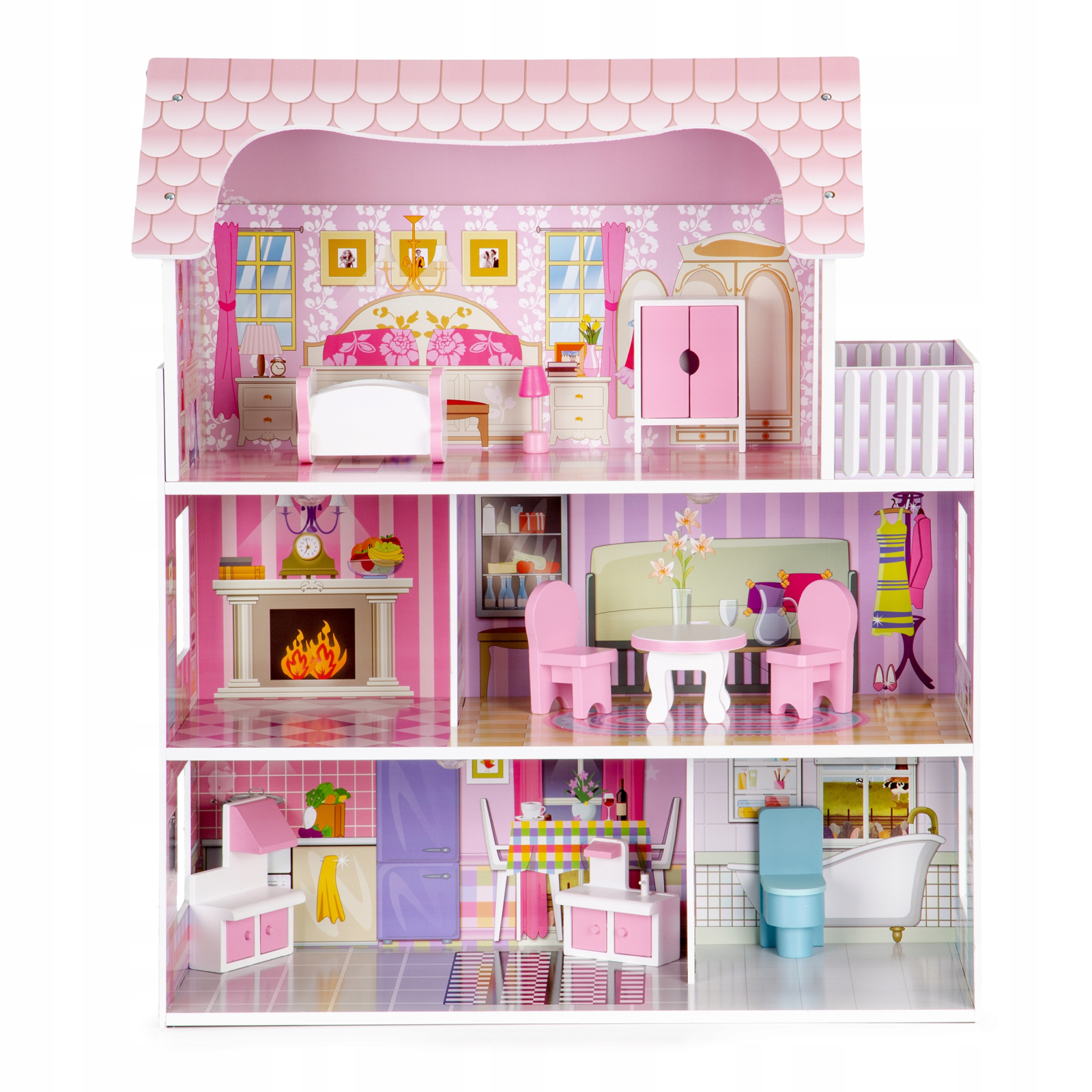 - Duży, drewniany domek dla lalek z mebelkami do urządzania pokoi i oświetleniem LED. Zabawka wspiera poprawny rozwój Twojego dziecka, pobudza jego wyobraźnię i logiczne myślenie. Dla dzieci od lat 3.