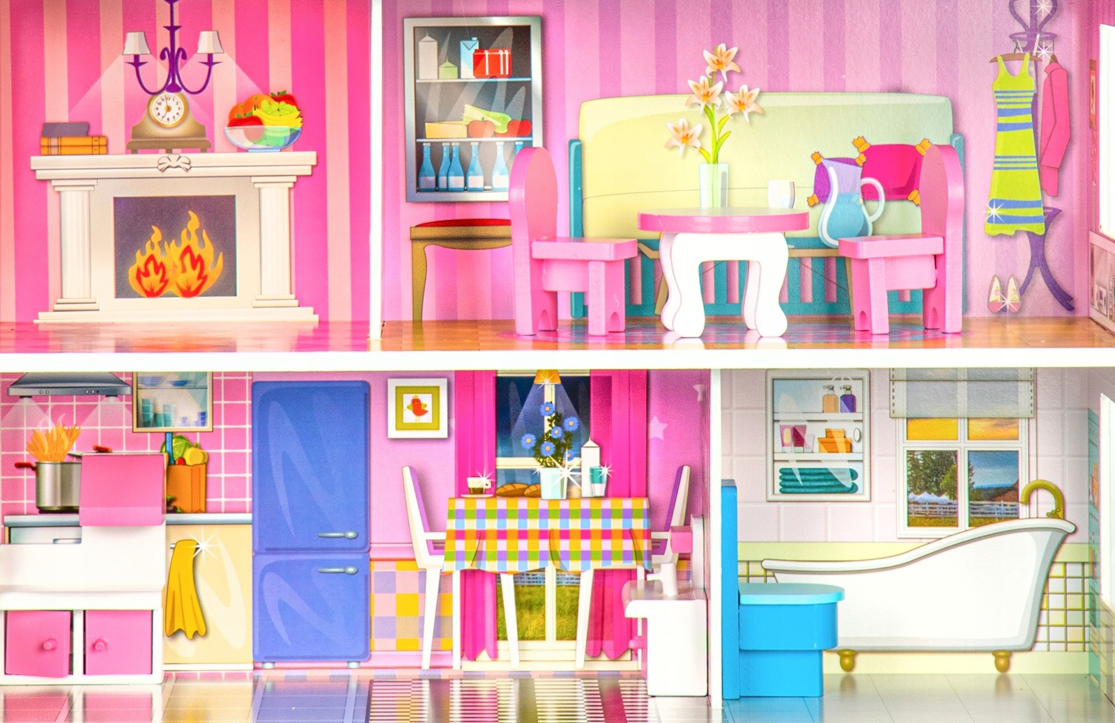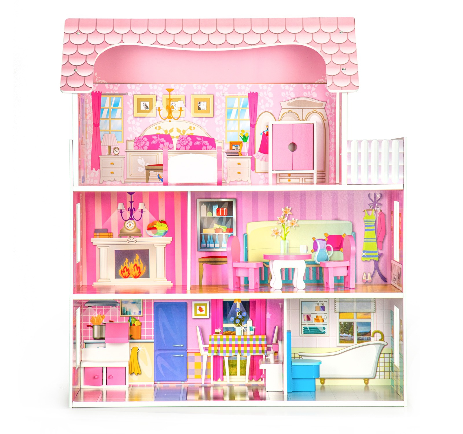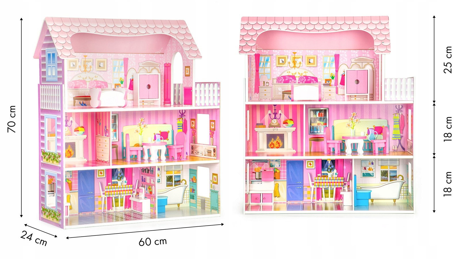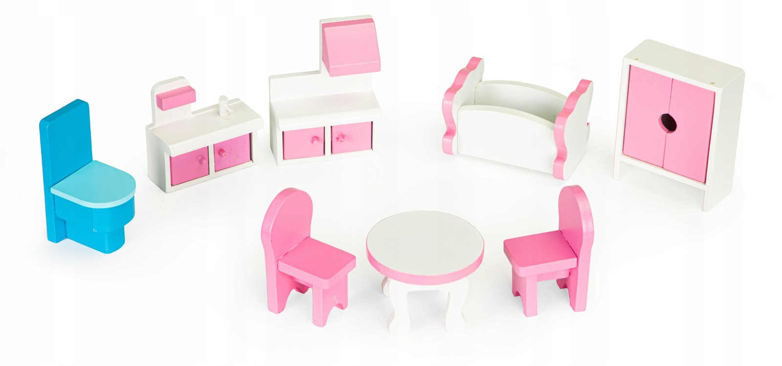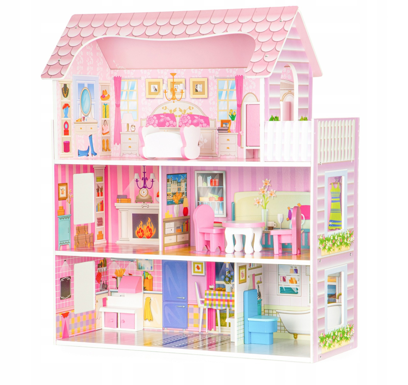 - Piękny, różowy, drewniany domek dla lalek z zestawem mebelków do urządzania pomieszczeń. Zabawka wspiera poprawny rozwój Twojego dziecka oraz pobudza jego wyobraźnię. Dla dzieci od lat 3.