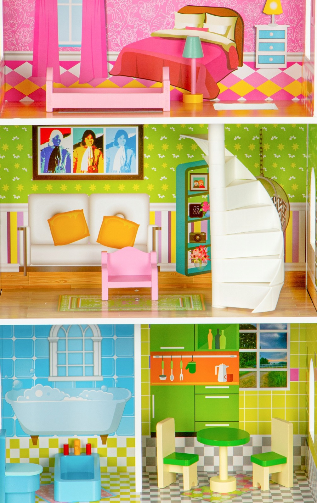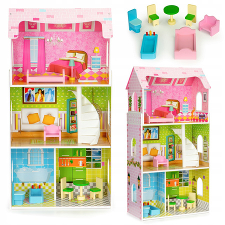 Wybierz dla swojej córki wysoki, wykonany z drewna domek dla lalek. Kolorowy, trzypiętrowy i bardzo przestronny na pewno przypadnie do gustu każdej małej księżniczce. Dbając o komfort mieszkających w nim lalek, wyposażono go w śliczne, zakręcone białe schody, a dołączone do zestawu, urocze, drewniane mebelki sprawiają, że nic nie stoi na przeszkodzie zabawie w architekta. Ustawiaj je według własnej wizji na, aż trzech piętrach powierzchni, w kuchni, łazience, salonie, jadalni, sypialni lub na balkonie. Do dyspozycji jest, aż 8 mebelków, które tak jak całość, wykonane są z wysokiej jakości drewna. Dbałością o każdy detal gwarantuje trwałość przez wiele długich lat. Domek jest całkowicie bezpieczny nawet dla najmłodszych, nie posiada ostrych krawędzi i małych elementów. Taki prezent jest idealny do wspólnej zabawy, dzięki czemu twoje dzieci mogą budować trwałe więzi przyjaźni. Będzie również doskonałą ozdobą do dziewczęcego pokoju.
