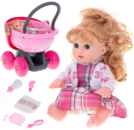 Interaktywna lalka Ala w sukience z wózkiem wydająca dźwięki Sika Pije 7 akcesoriów