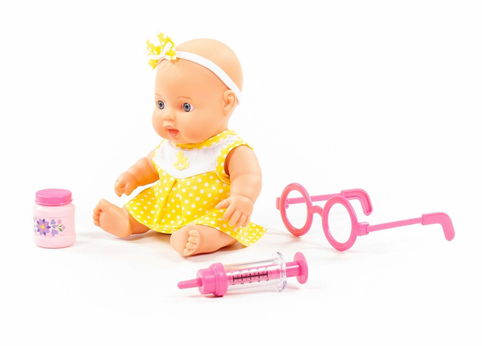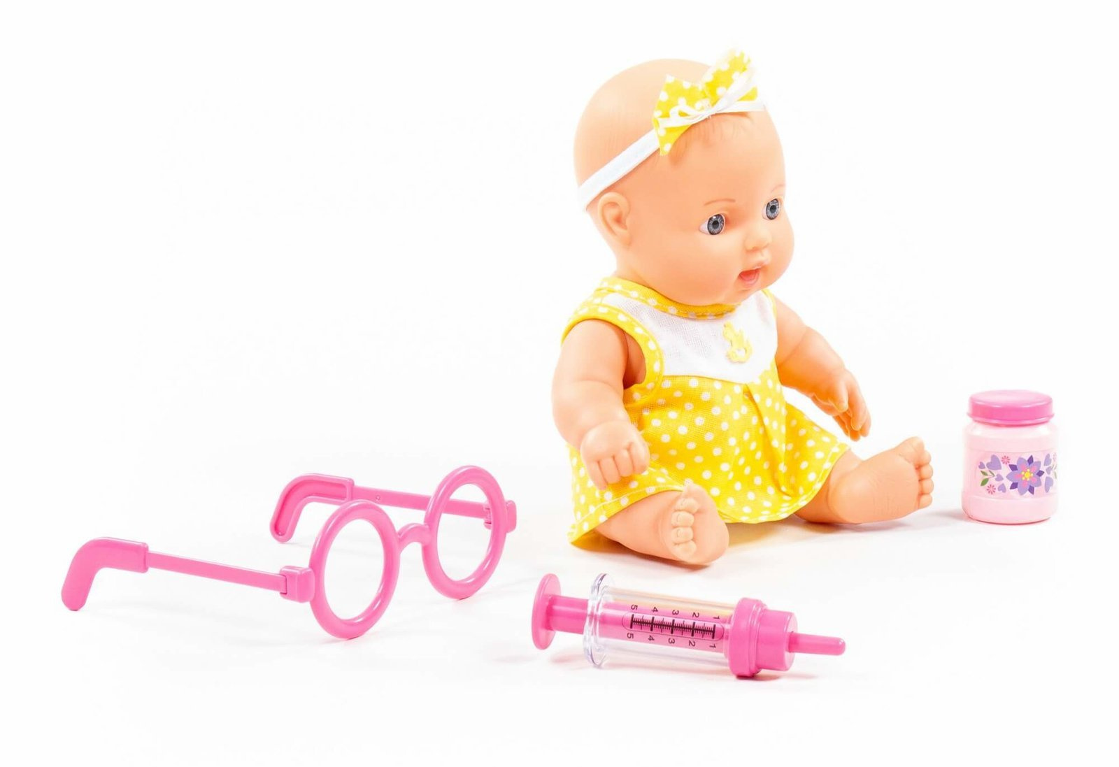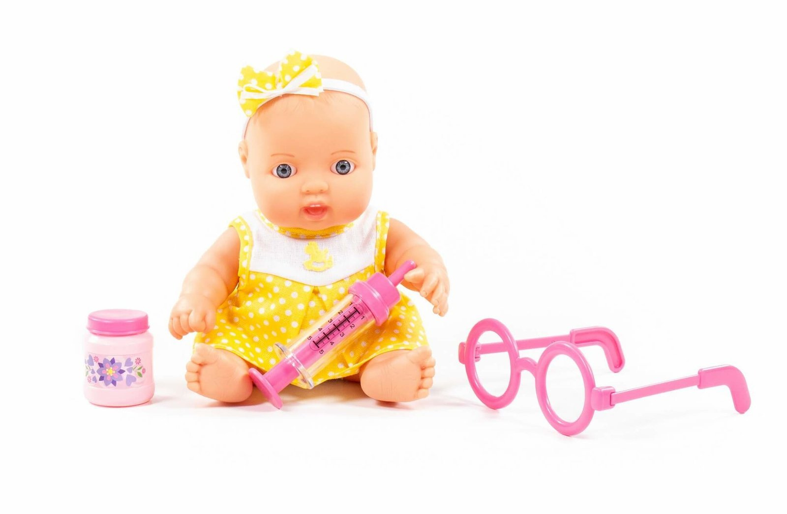 Zestaw idealny dla małej dziewczynki ze śliczną laleczką bobasem w żółtej sukience. Dzięki zabawce, nauczysz swoje dziecko odpowiedzialności oraz opieki nad drugą osobą. Lalka wygląda bardzo realistycznie dzięki swojemu ubranku i i dbałości o każdy detal, zadaniem Twojego malucha jest opieka nad zabawką. W zestawie Twój maluch znajdzie również akcesorium lekarskie tj. strzykawkę, kubeczek na akcesoria i okulary. Całość jest całkowicie bezpieczna dla dzieci, a dzięki wykorzystaniu trwałych materiałów, posłuży ona na kilka lat.DANE TECHNICZNE: