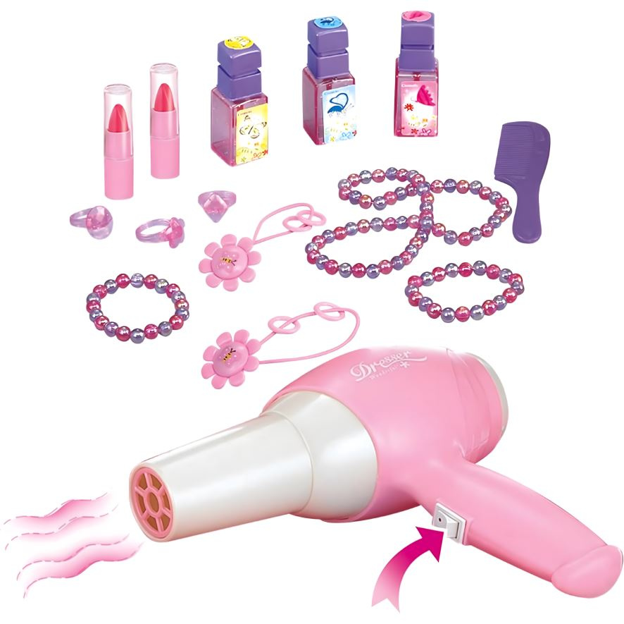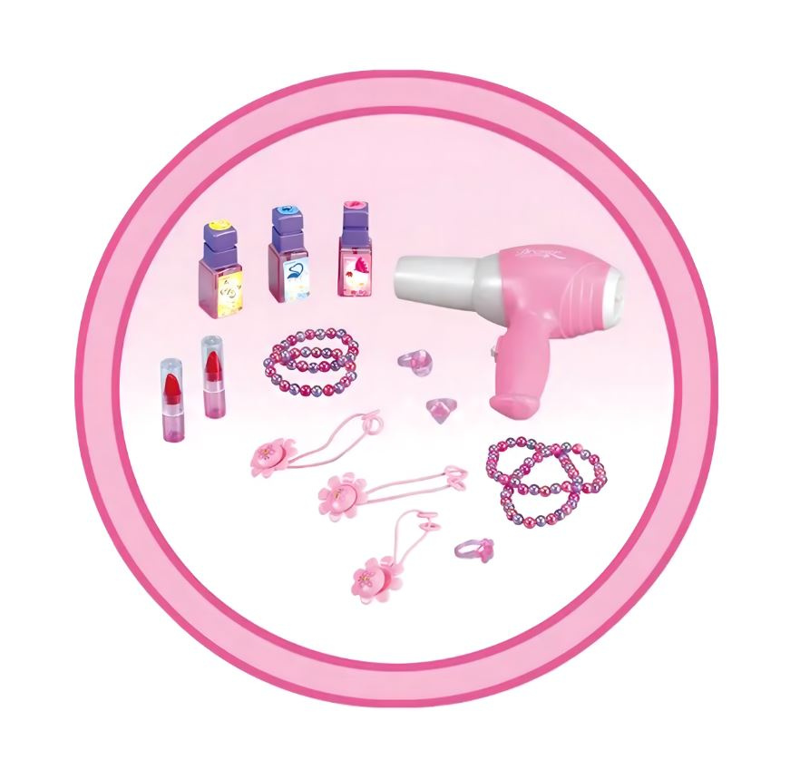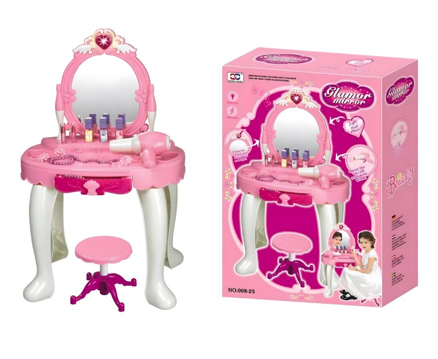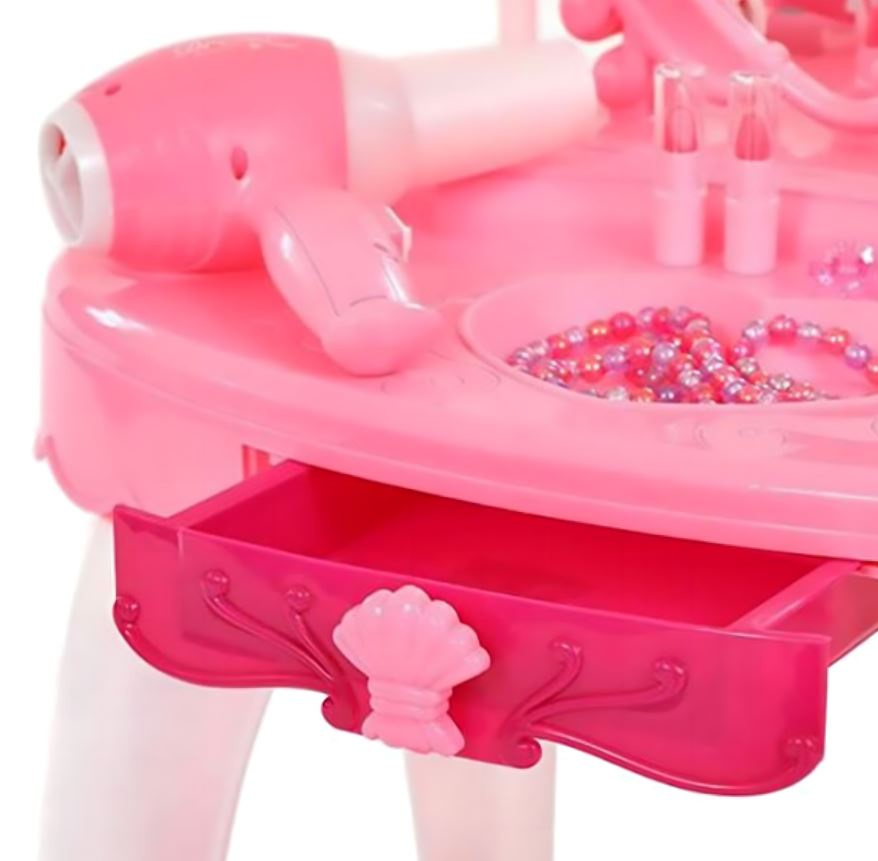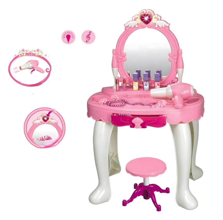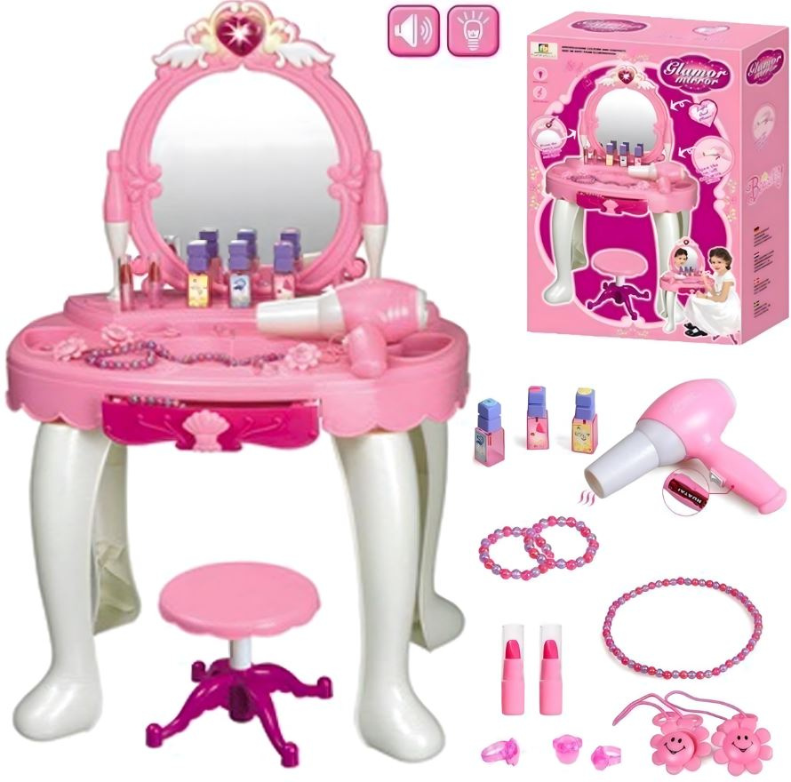 - Różowa toaletka dla dziewczynki z efektami świetlnymi oraz dźwiękowymi. W zestawie znajduje się taborecik oraz suszarka na baterię, która wydmuchuje powietrze. Dla dzieci od 3 lat.