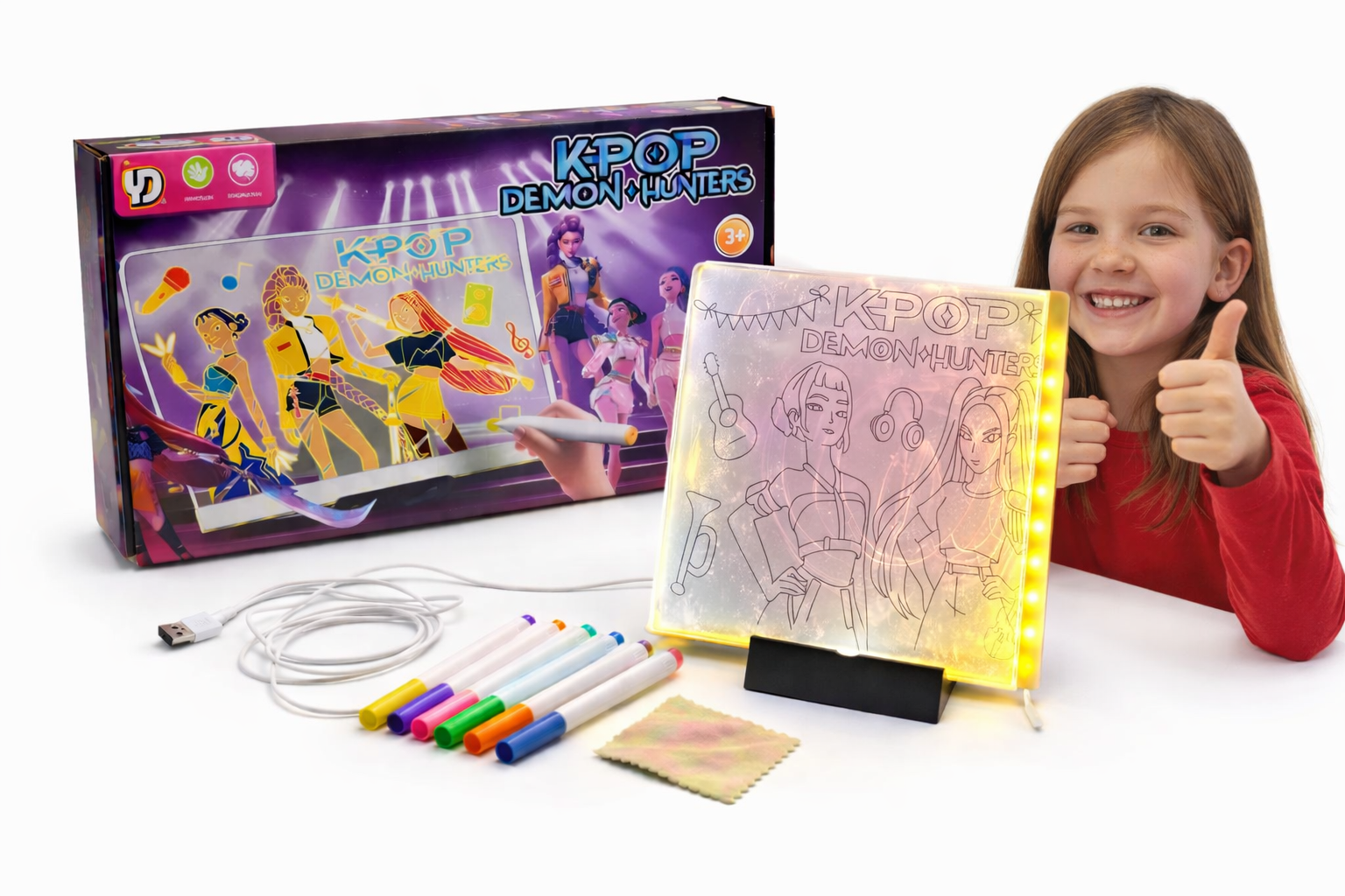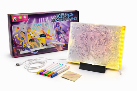Twoje dziecko jest fanem filmu animowanego „K-popowe łowczynie demonów”? Świetnie się składa! Przedstawiamy tablicę podświetlaną, która doskonale sprawdzi się na prezent niezależnie od okazji. Dziecko może rysować oraz malować ulubione postacie z tej bajki. W zestawie znajduje się tablica z kablem, a także co ważne pisaki oraz wzory rysunków, które przy użyciu dołączonej tablicy i pisaków mogą zostać pomalowane.