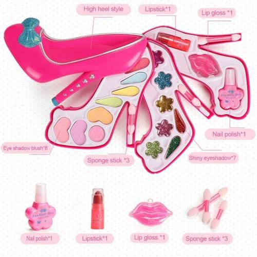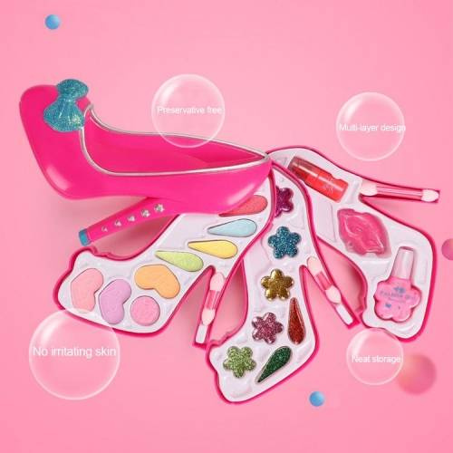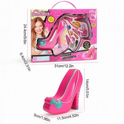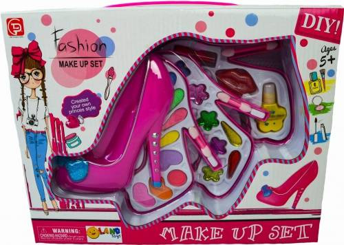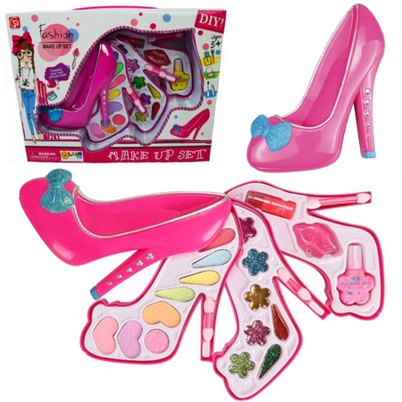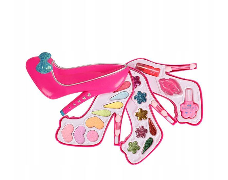 Wszystkie kosmetyki są bezpieczne w użytkowaniu przez dzieci. W zestawie znajdziemy ich przeróżne rodzaje, m.in.: cienie, błyszczyk oraz lakier do paznokci. Maluch wcielając się w rolę kosmetyczki rozwija wyobraźnie oraz poczucie estetyki. Kosmetyczkę w kształcie pantofelka można zabrać ze sobą, tam gdzie tylko ją potrzebujemy, np. na spotkanie z przyjaciółkami. Zestaw do makijażu będzie idealnym prezentem, jeśli dziecko zaczyna interesować się wyglądem lub światem mody.DANE TECHNICZNE
