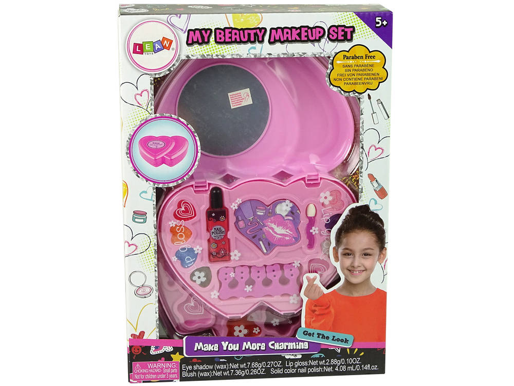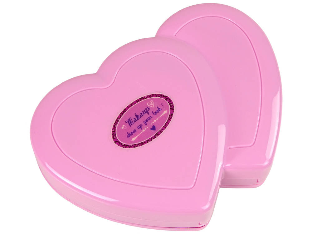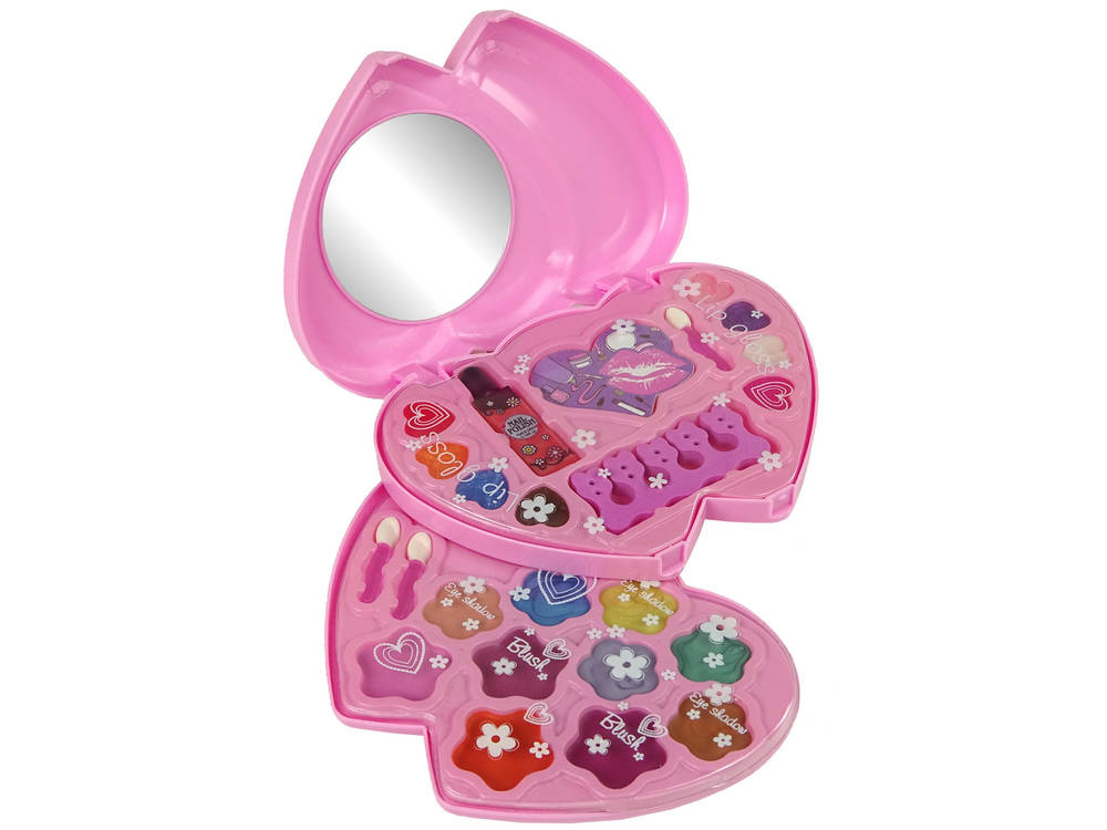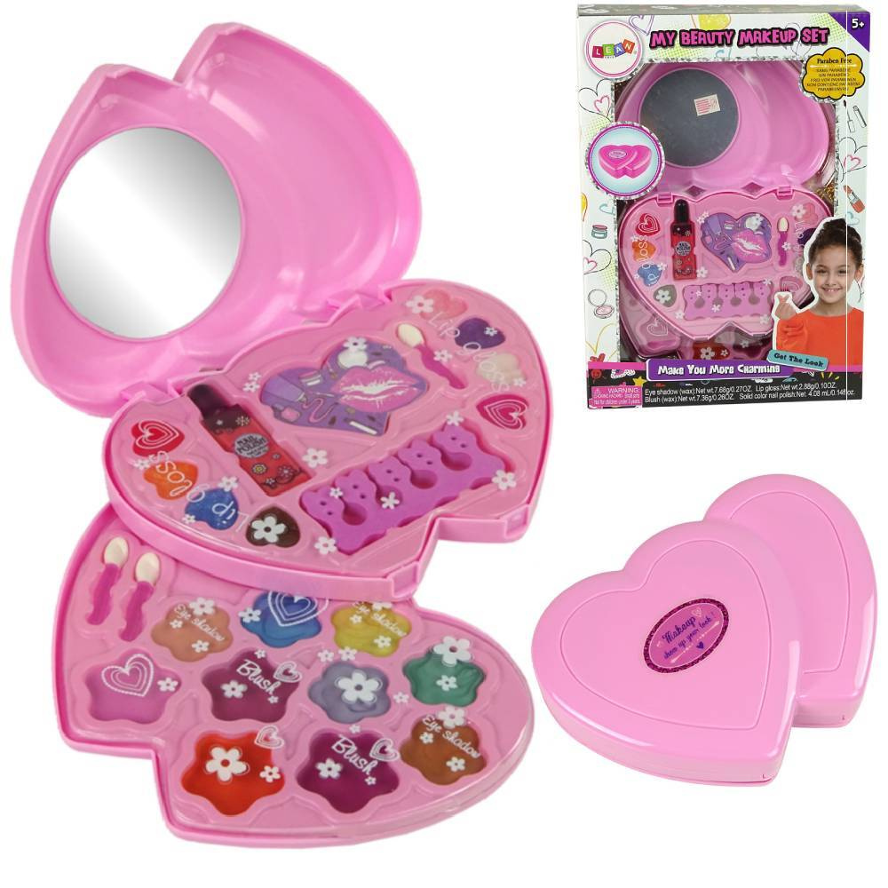 Każda mała dziewczynka zwraca uwagę na swój wygląd. Chce wyglądać i być jak jej mama. Dzieci zazwyczaj upiększają się za pomocą różnych dodatków do włosów, paznokci lub ubrań. Często też podbierają kosmetyki starszym i tworzą oryginalne makijaże. Już teraz Twój maluch może pomalować swoją buzie bezpiecznymi produktami. Kosmetyki zapakowane są w poręczną, rozkładaną kosmetyczkę, w kształcie serca, która z pewnością znajdzie miejsce w pokoju małej makijażystki. Zestaw sprawdzi się idealnie na prezent dla dziewczynki dbającej o swoją urodę.ZESTAW DO MAKIJAŻU PALETKA W KSZTAŁCIE SERCA