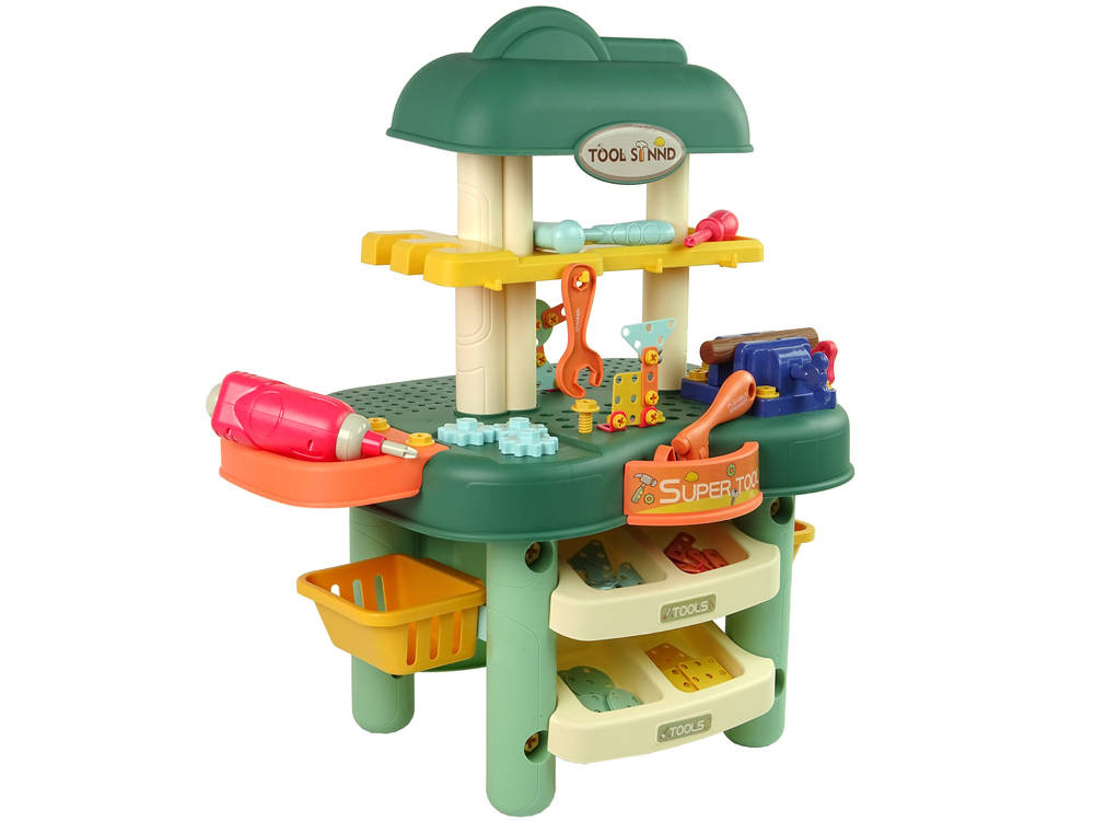 W warsztacie majsterkowicza nie ma czasu na nudę. Zestaw idealny na prezent dla prawdziwego Pana domu, już od 3 roku życia. Wśród narzędzi znajdziemy wiertarkę na baterię. Używając jej Twoje dziecko ma możliwość konstruować różne figury, za pomocą śrubek i dołączonych figur geometrycznych. Pobudzi to jego wyobraźnie, a kącik zabaw nabierze nowych, ciekawych kształtów. Warsztat z plastikowymi narzędziami dla dzieci jest idealną alternatywą dla ciężkich, domowych przedmiotów. Zestaw zawiera różnego rodzaju narzędzia.DANE TECHNICZNE