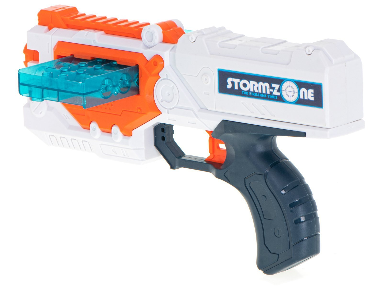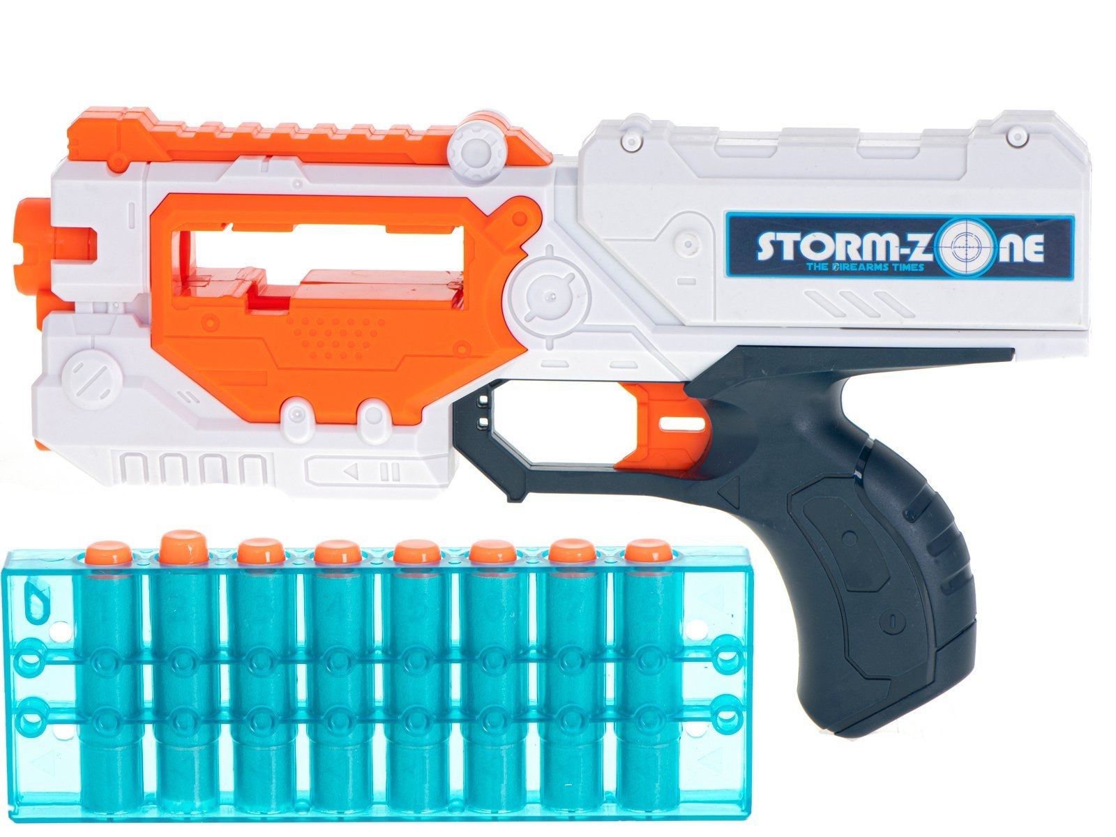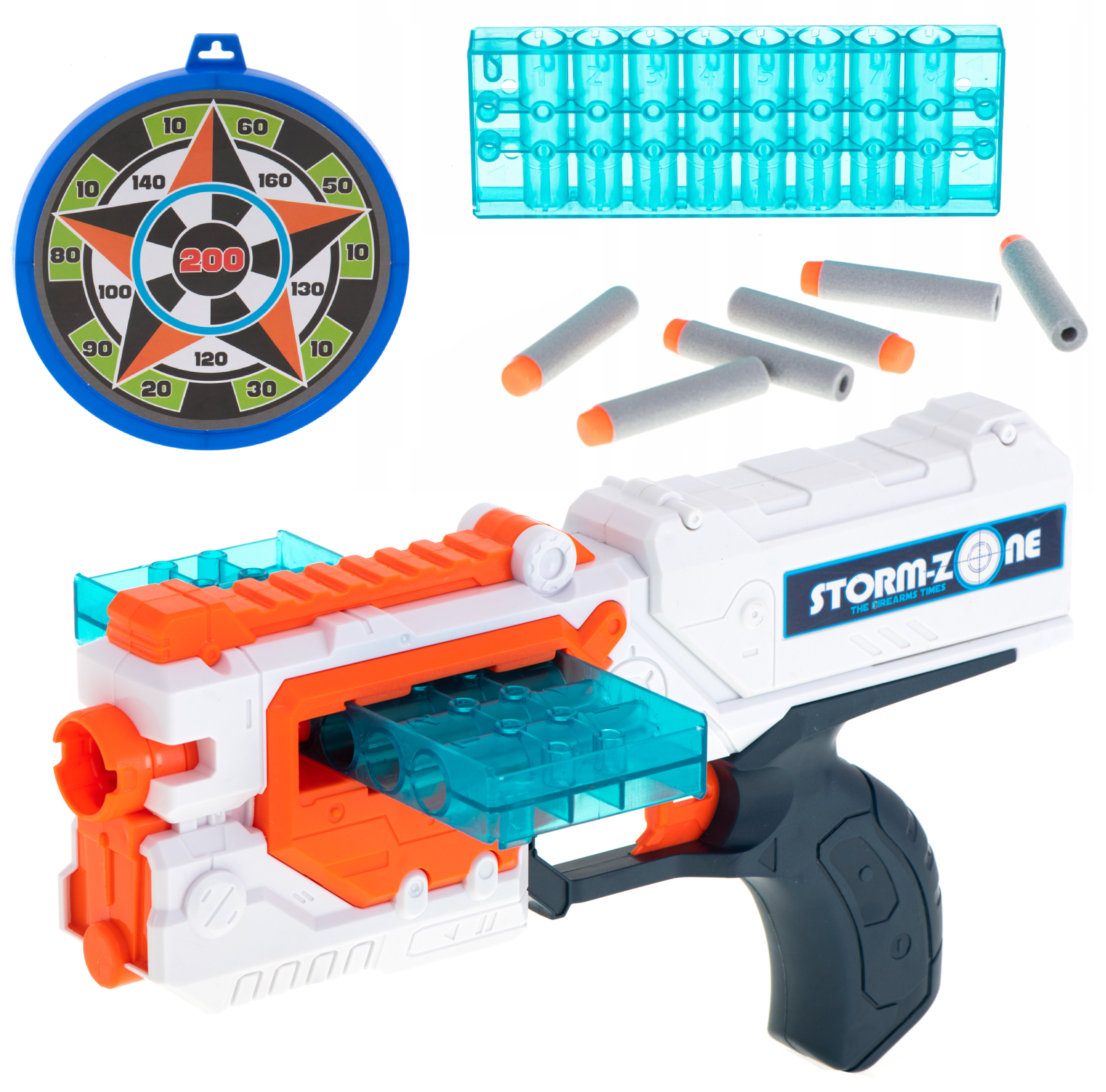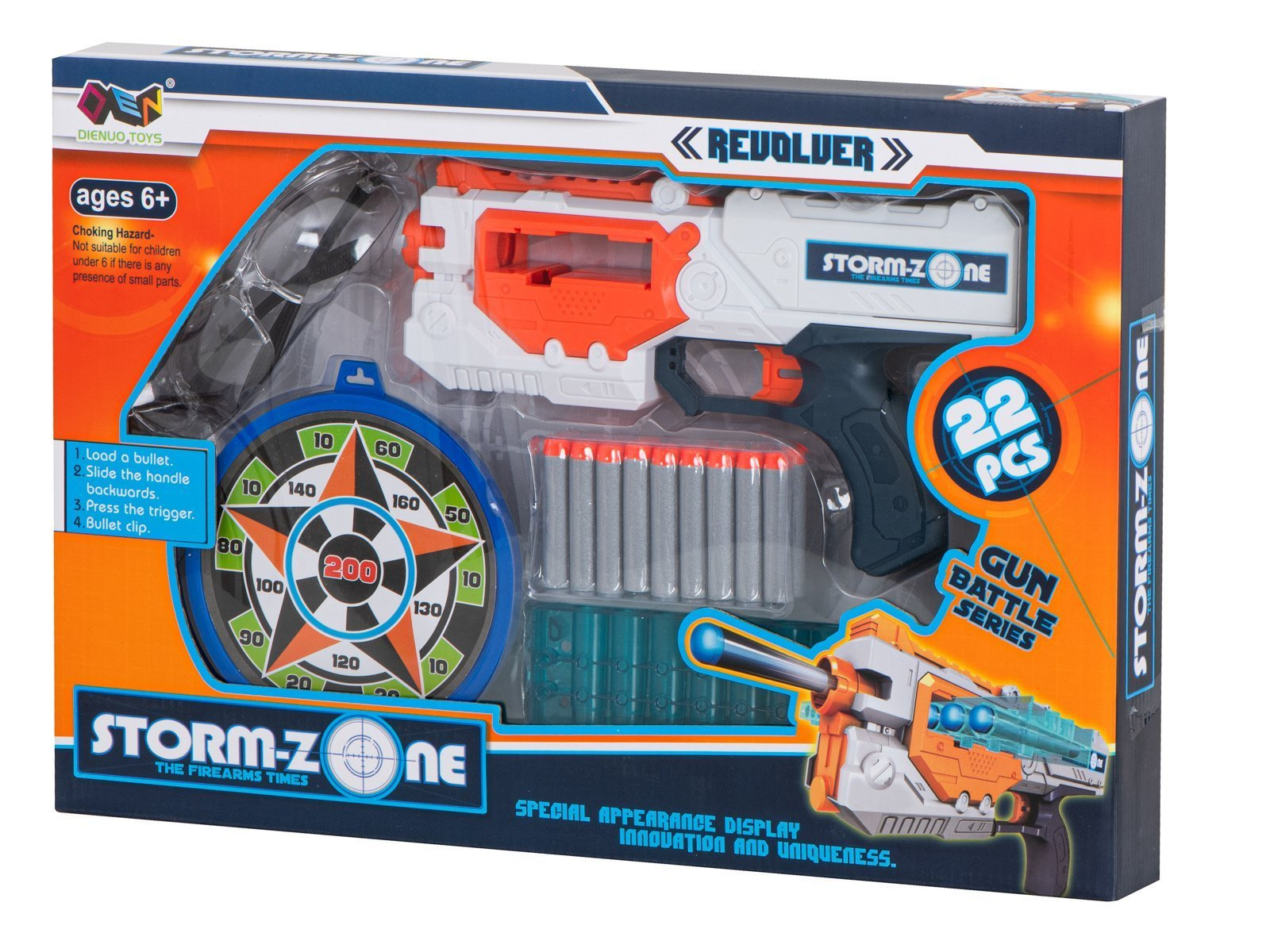 - Pistolet z zestawem 18 miękkich nabojów dostarczy Twoim maluchom mnóstwo zabawy oraz sprawi, że Twoje dzieci będą mogły poczuć się jak prawdziwi strzelcy z filmów akcji. Do użytku od lat 6.