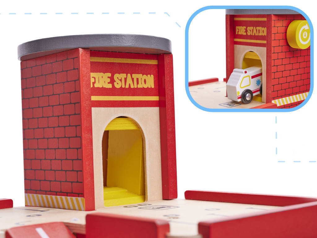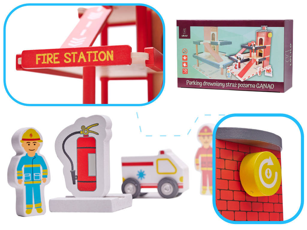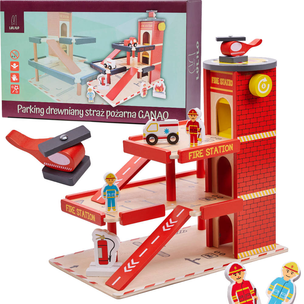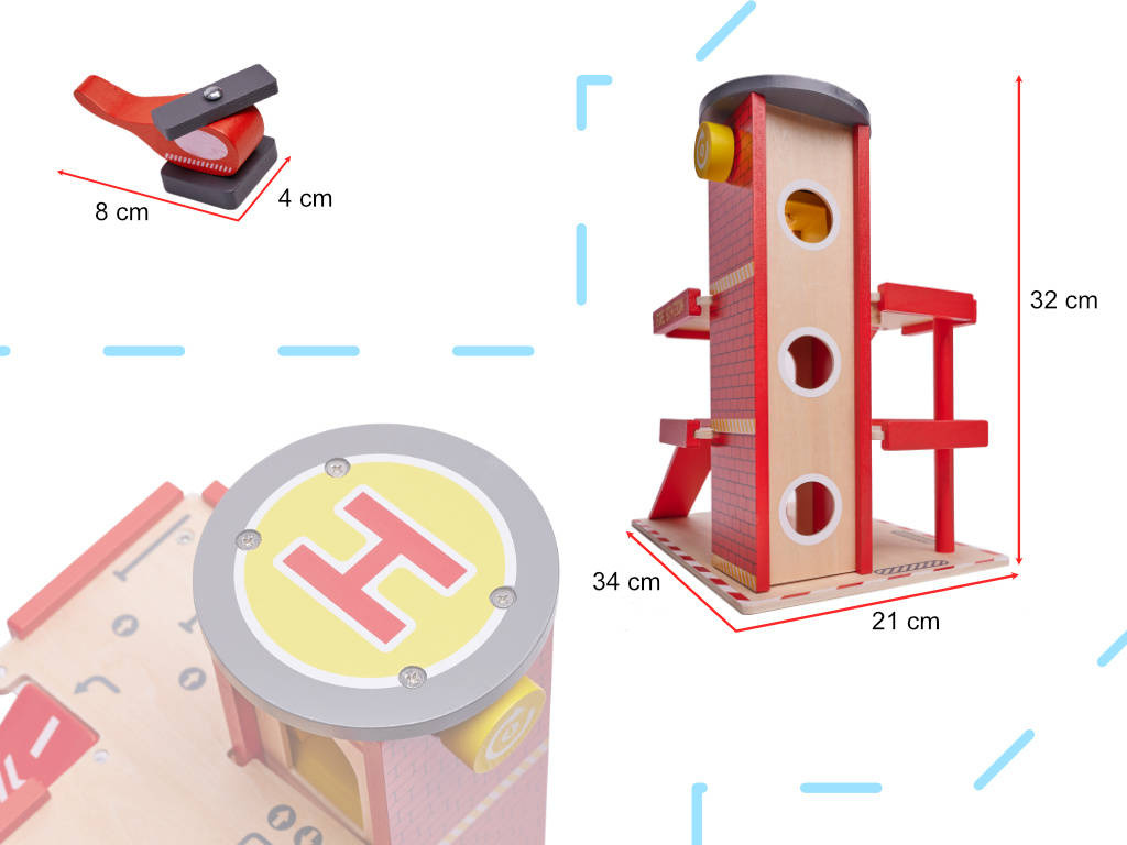 Piękny, trzy poziomowy parking dla miłośników straży pożarnej. Wykonany z szczególną dbałością o szczegóły, pomalowany nietoksycznymi farbami bezpiecznymi dla małych dzieci. Do zestawu dołączono dwie figurki strażaków, helikopter, karetkę pogotowia i figurkę gaśnicy. Na parkingu jest miejsce na zaparkowanie wielu autek z kolekcji dziecka. Małr samochodziki można wwozić na wyższe poziomu parkingu windą. Winda sterowana jest za pomocą pokrętła umieszczonego na ścianie wieży.STRAŻ POŻARNA - DREWNIANY PIĘTROWY PARKING