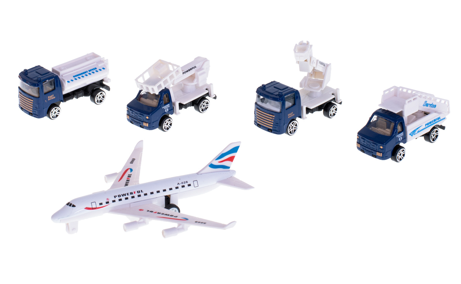 - Zestaw pojazdów dla dzieci z 4 samochodami ciężarowymi oraz samolotem