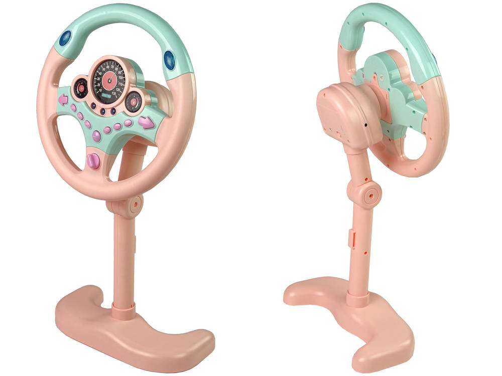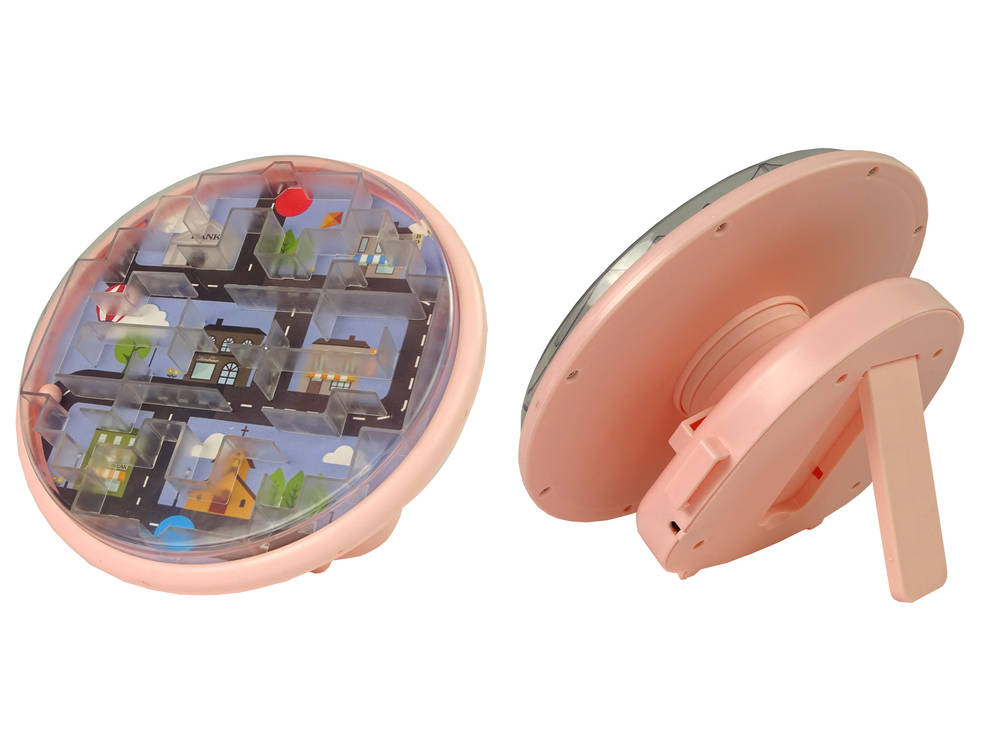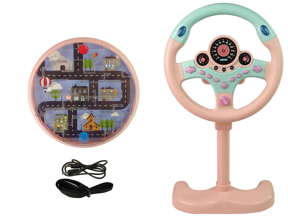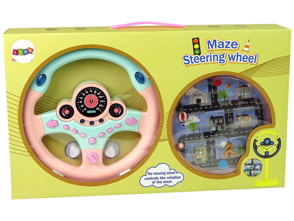 - Zabawkowa kierownica dla dzieci w kolorze różowym. W zestawie kierownica oraz miasteczko z kulką. Można nią sterować obracając labiryntem lub kierownicą. Dla dzieci powyżej 3 roku życia.