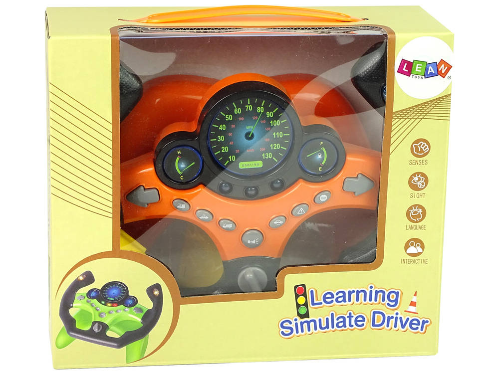 Zabawkowa, interaktywna kierownica posiada kolor pomarańczowo-czarny, przez co sprawdzi się zarówno dla chłopców, jak i dziewczynek. Posiada ona dziewięć przycisków, a każdy z nich jest odpowiedzialny za inną funkcję, m.in.: klakson lub sygnały służb drogowych. Elementem, który na pewno przyciągnie uwagę malucha są podświetlane zegary na kolor niebieski. Pozwól poczuć się dziecku jak prawdziwy kierowca.DANE TECHNICZNE