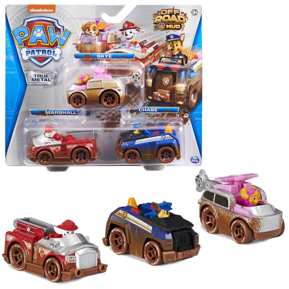 Zabawka z serii Psi Patrol: Off-Road Mud przeniesie Cię w świat serialu z ulubionymi bohaterami. W zestawie znajdziesz trzy modele pojazdów w skali 1:55. Zabierz Marschalla, Sky i Chase'a na bezdroża i baw się dobrze.AUTKA TRUE METAL Z SERII PSI PATROL DLA DZIECI