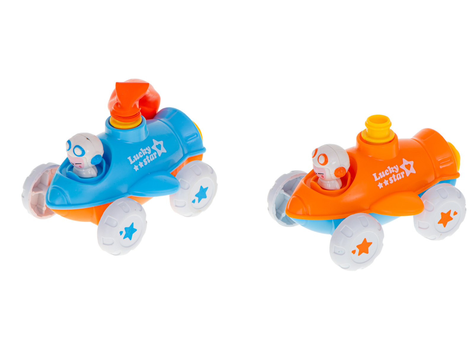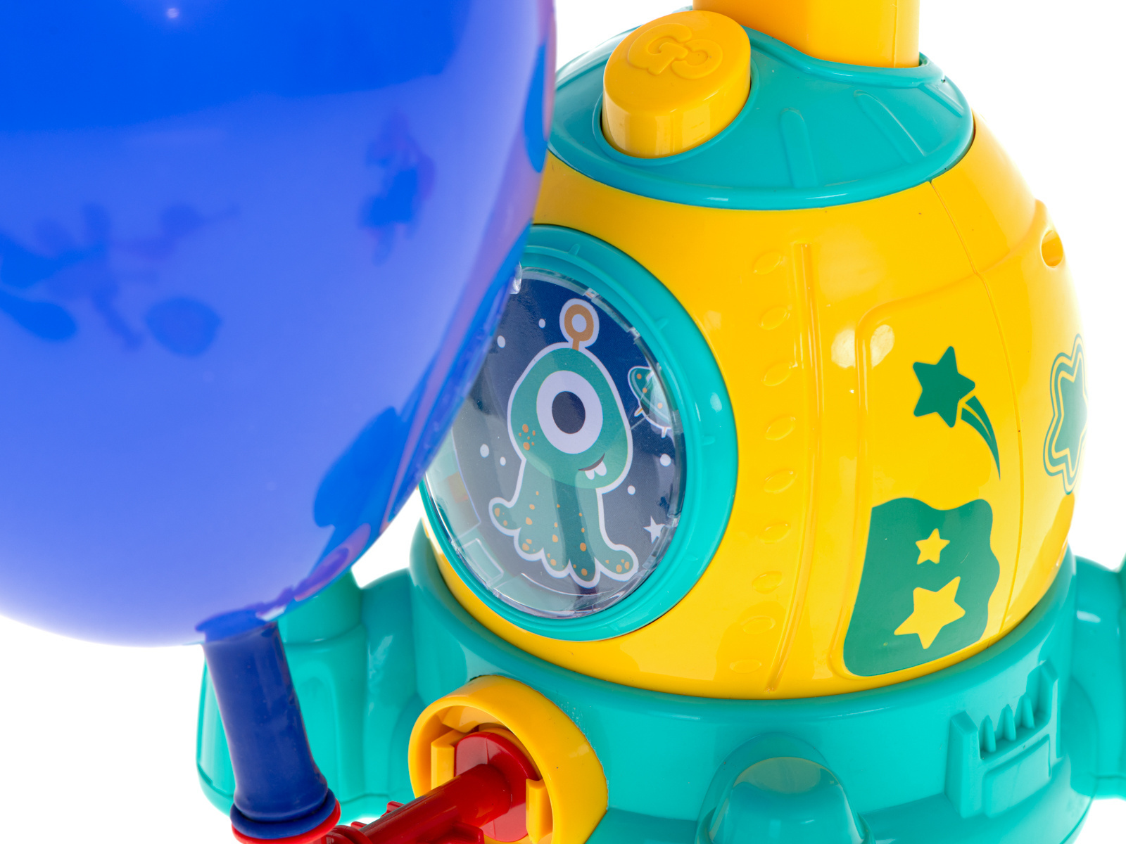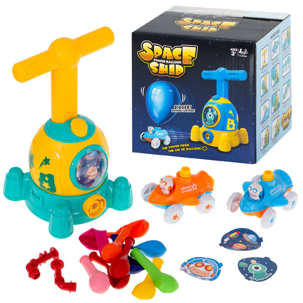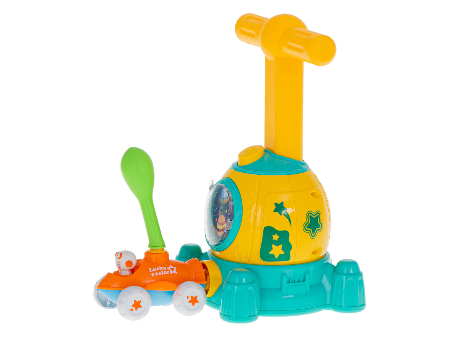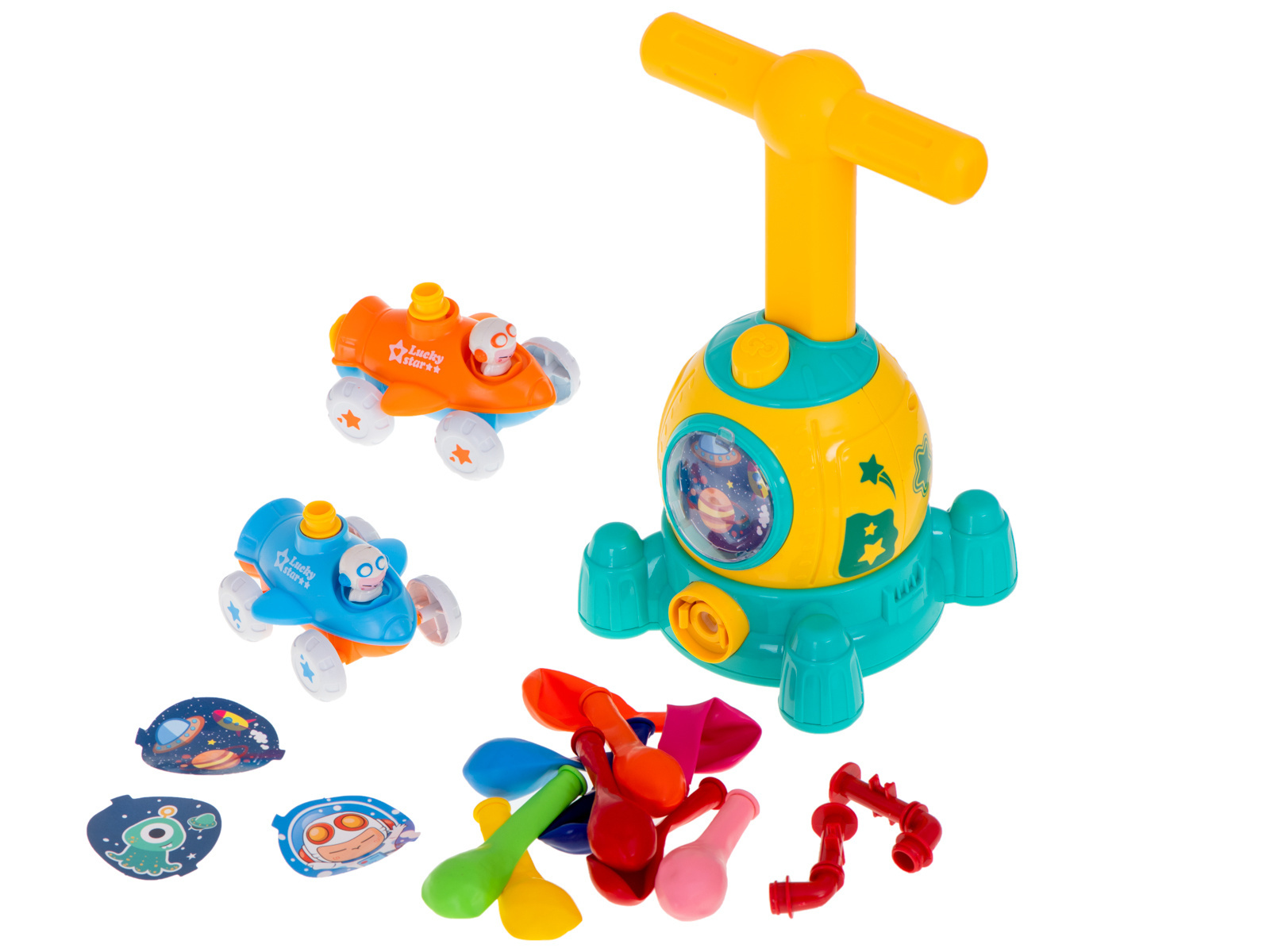 Kosmiczna wyrzutnia samochodzików aerodynamicznych. Samochodziki napędzane są powietrzem wypływającym z balonów. Jak to działa? Do autka przyczepiamy pusty balonik, następnie autko doczepiamy do rakiety-pompki. Pompujemy balon, gdy odczepimy samochodzik to pomknie on siłą napędu powietrza z balonika.Możemy urządzić zawody czyj samochodzik pojedzie najdalej. W zestawie znajdziesz dwa kosmiczne pojazdy i 10 baloników aby zabawa mogła trwać od pierwszej chwili przez długi czas.