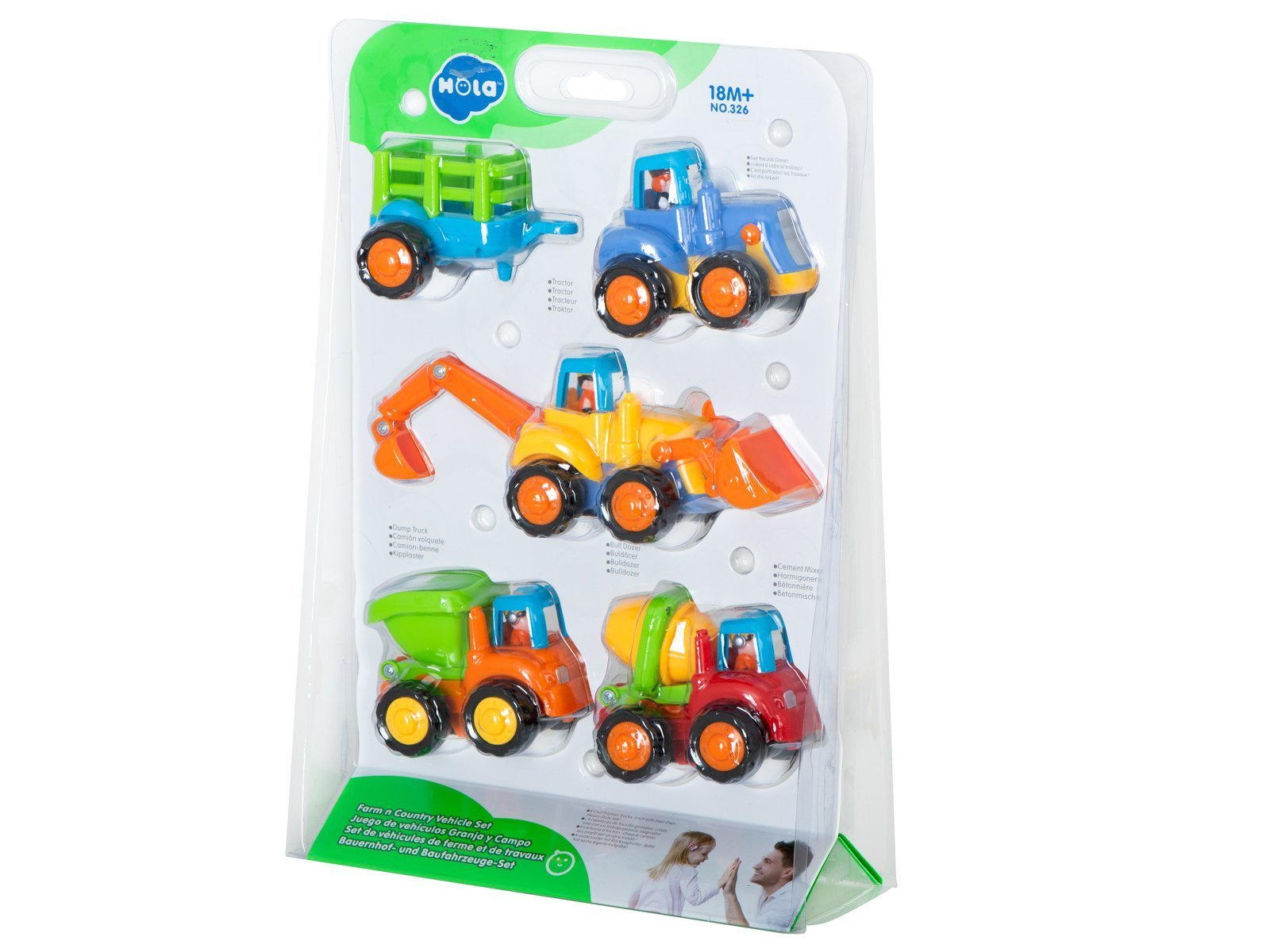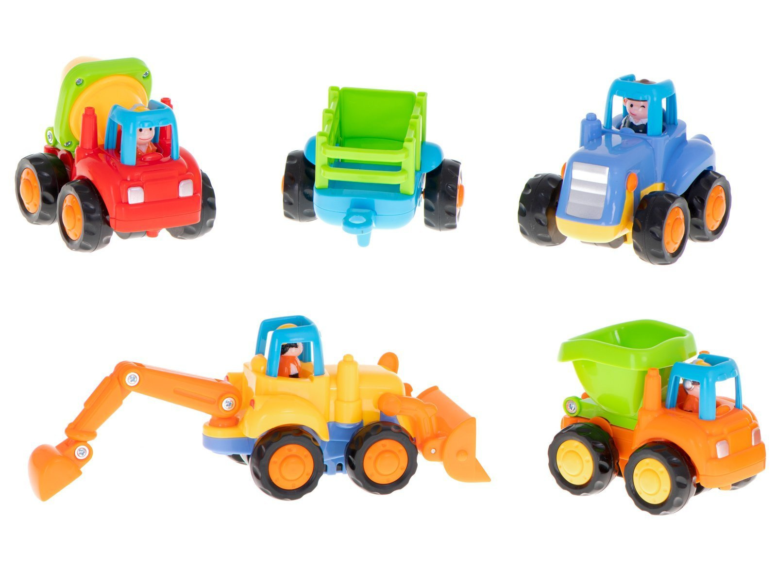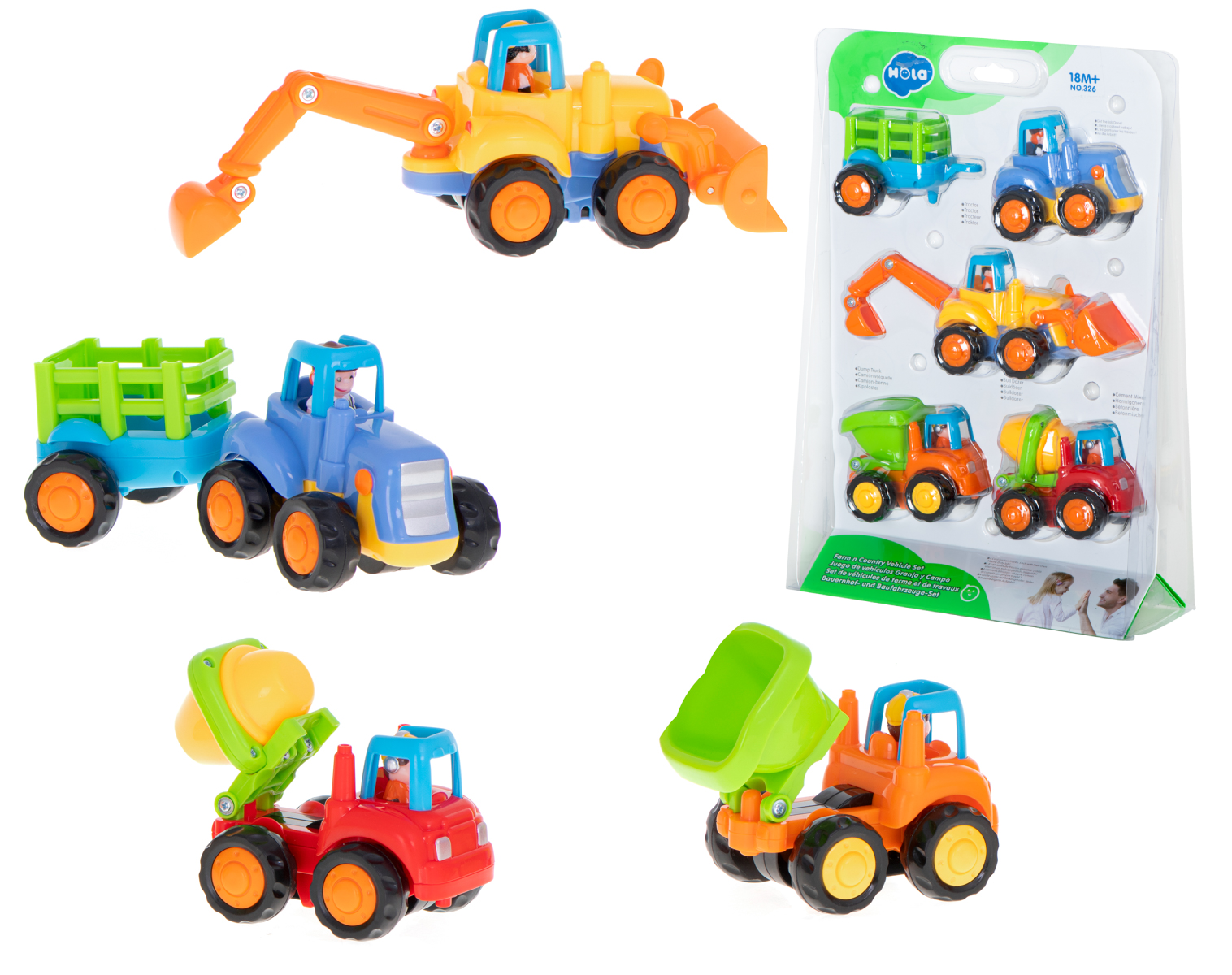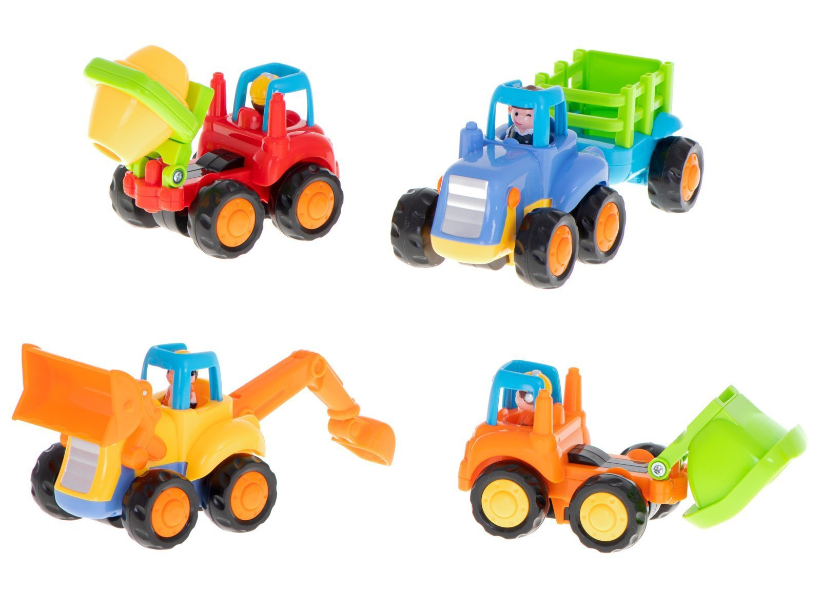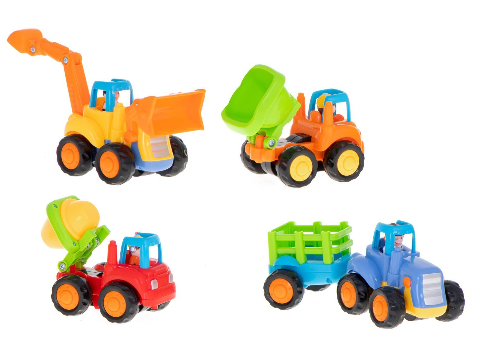 Zestaw 4 odpornych na uderzenia pojazdów budowlanych dla dzieci: traktor z przyczepą, koparka, wywrotka i betoniarka do zabawy. Dla dzieci od 18 miesiąca życia.