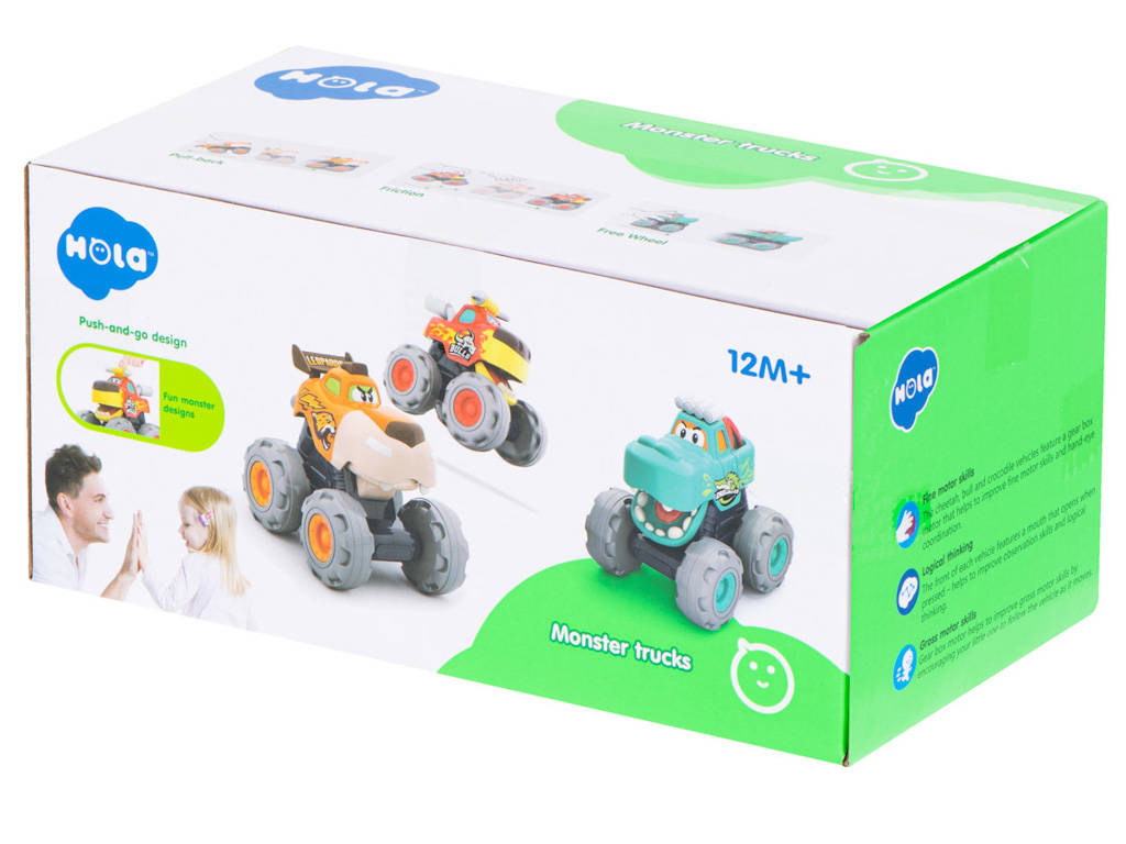 Niezwykłe samochodziki w kształcie zwierzątek to super propozycja dla każdego wyścigowca. Pojazdy dzięki większym kółeczkom, wyglądem przypominają znane Monster Trucki. Żywa kolorystyka przyciąga wzrok każdego, ale to nie wszystko. Każdy samochodzik posiada tajemniczy przycisk na dachu. Po jego naciśnięciu, zwierzątko otwiera swoją paszczę. Może z radości, iż może się z Wami razem bawić, a może, żeby przestraszyć konkurenta... Czas na wyścigi !Dwa pojazdy, z trzech dostępnych w zestawie, posiadają napęd. Fantastyczna funkcja, która daje dodatkowe możliwości zabawy i rywalizacji z innymi. Wystarczy naciągnąć tylne koła i już. Postawienie na linii startu i puszczenie samochodu wystarczy, aby popędził przed siebie.
