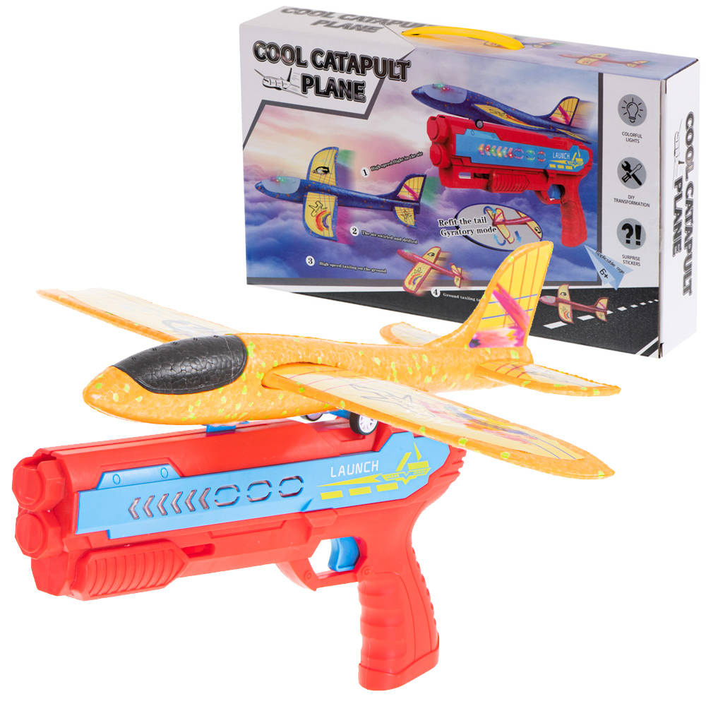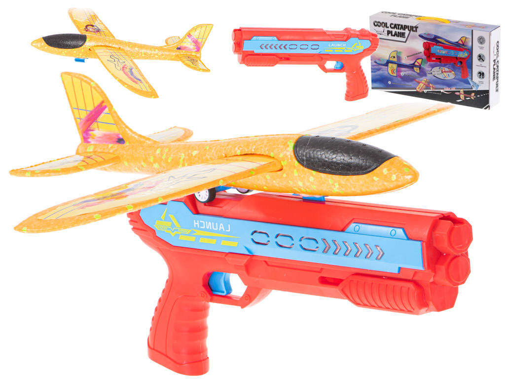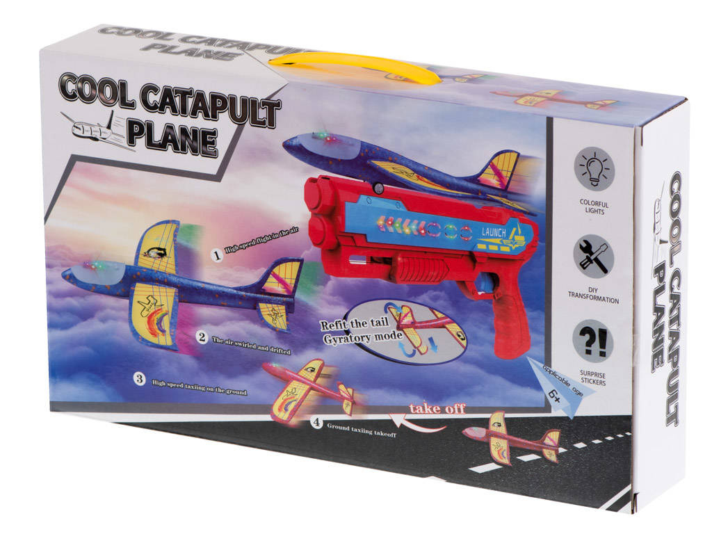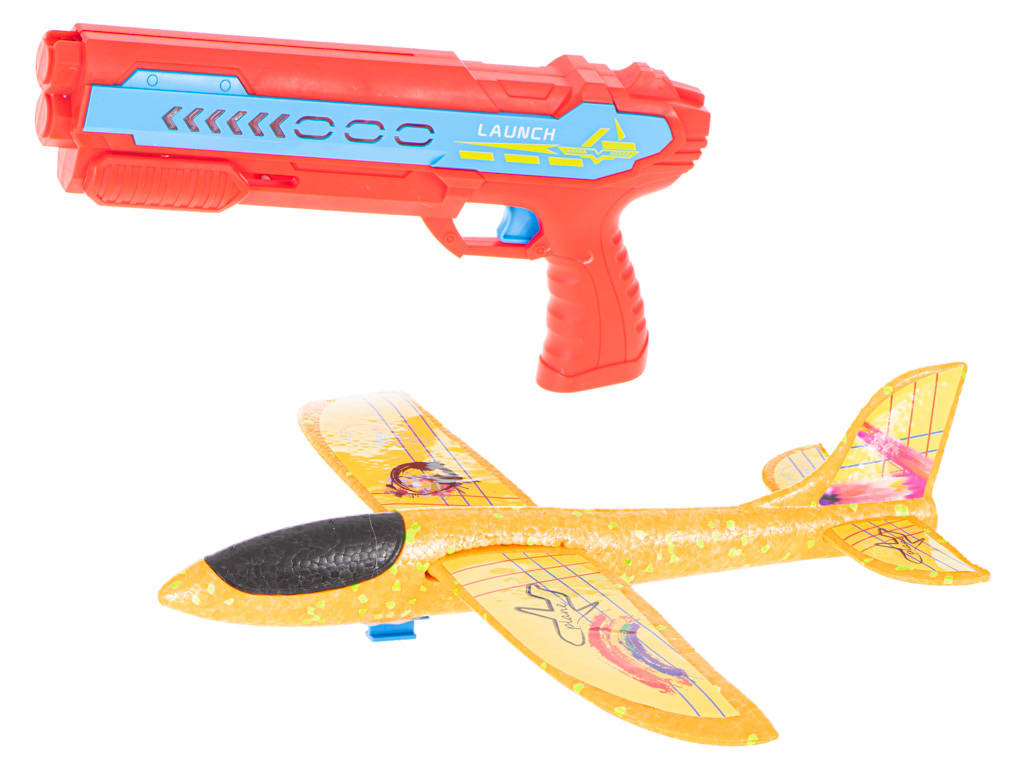 W zestawie jest jeden pistolet - wyrzutnia oraz jeden samolocik. Maszyna lotnicza jest wykonana ze styropianu, specjalnie, aby była jak najlżejsza i osiągi jak najlepsze. Samolot należy samodzielnie skompletować. Do kadłuba zamontować zestaw skrzydeł i wykorzystać zestaw naklejek dostępnych w komplecie. Da to na pewno poczucie jeszcze większej satysfakcji w późniejszych lotach.Nie wolno zapomnieć o zaznaczaniu miejsc lądowań samolotu, tak aby widzieć swoje wyniki i postępy w wystrzeliwaniu, ale również, aby rywalizacja z rówieśnikami była jeszcze bardziej emocjonująca. W estetycznym opakowaniu znajdują się: kadłub samolotu, skrzydła i zestaw naklejek, oraz oczywiście pistolet wyrzutnia.