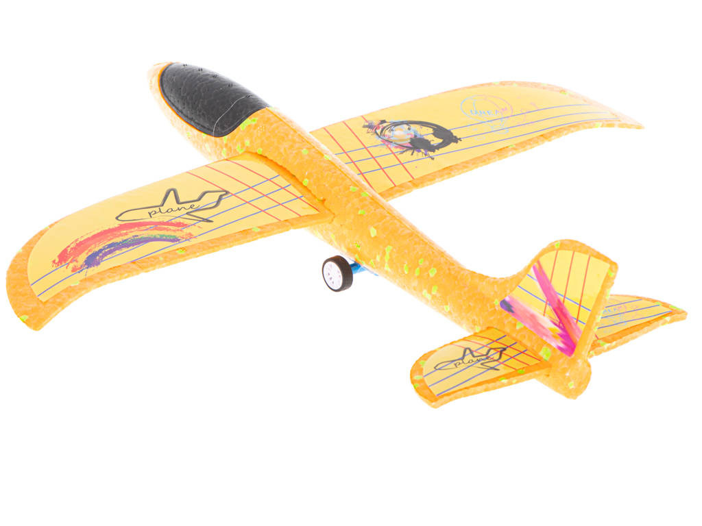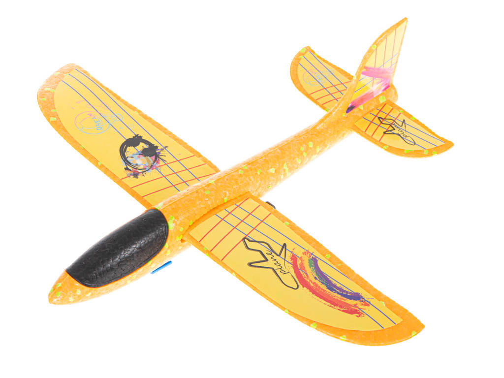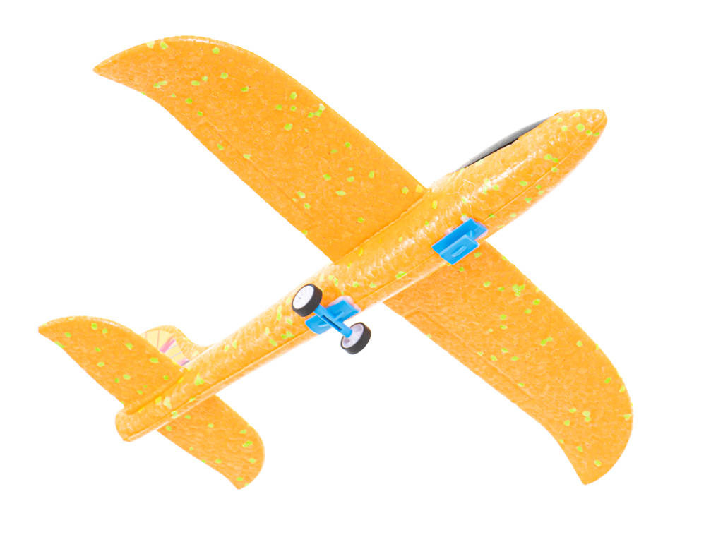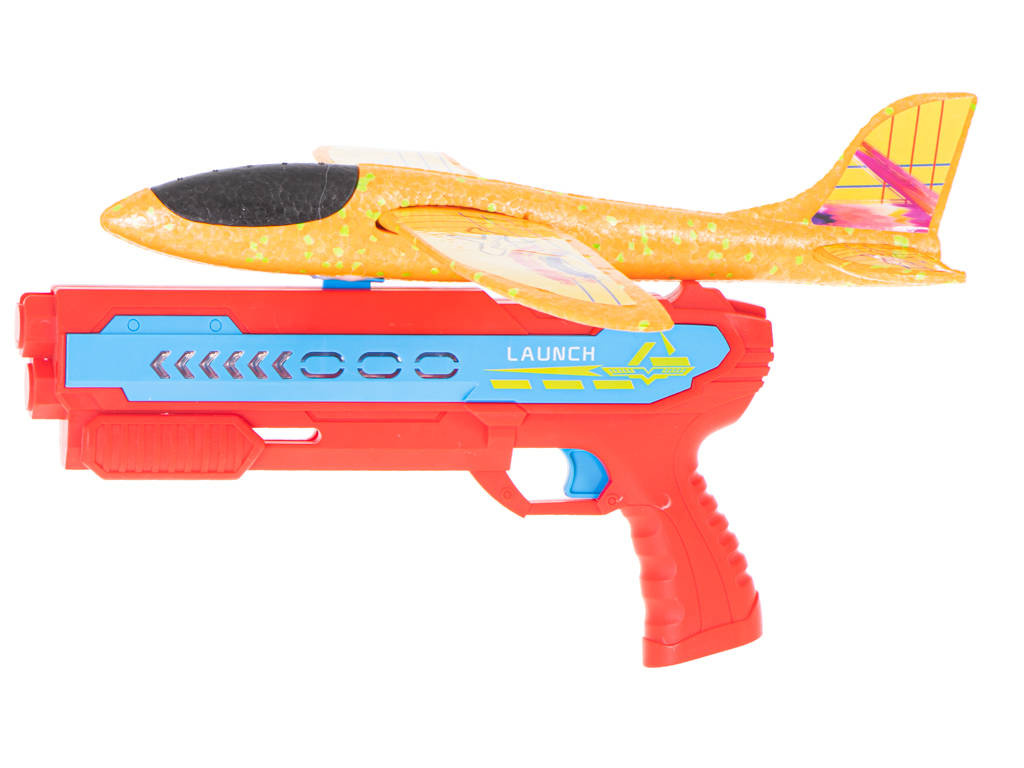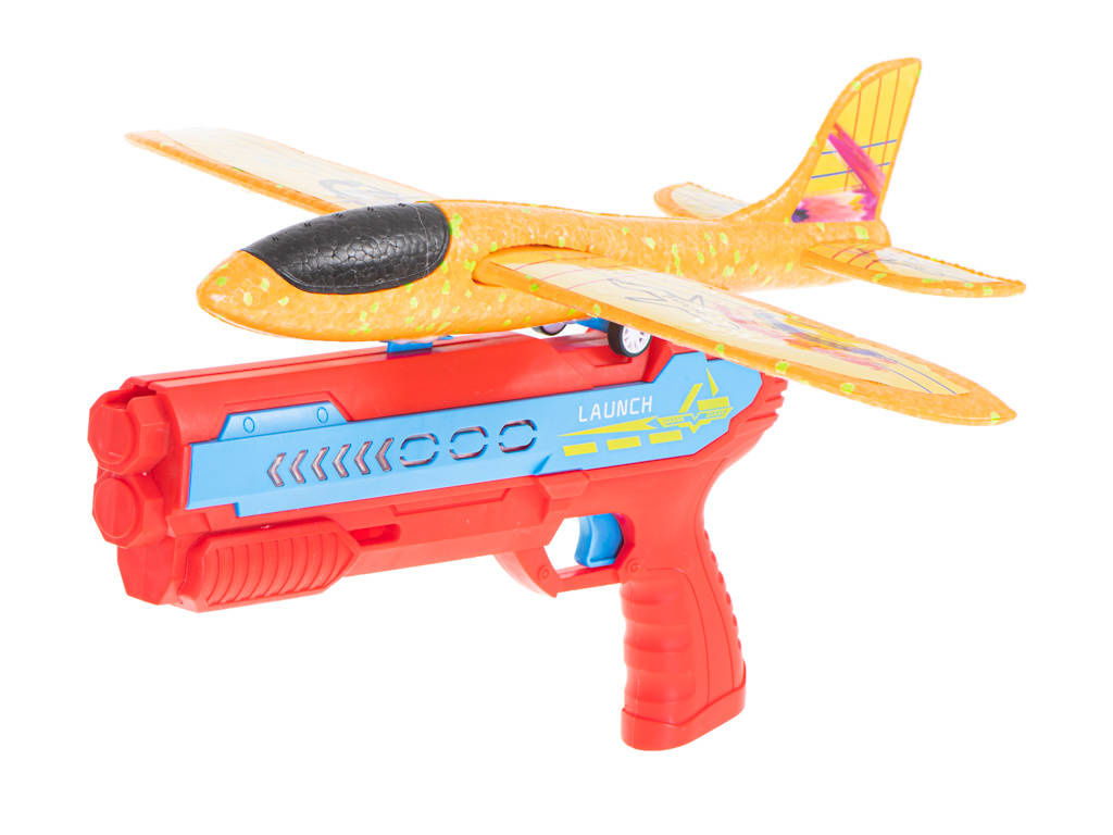 - Automatyczna wyrzutnia styropianowych samolotów w komplecie z pomarańczowym samolotem.