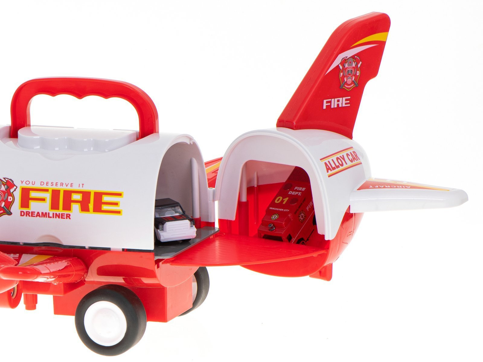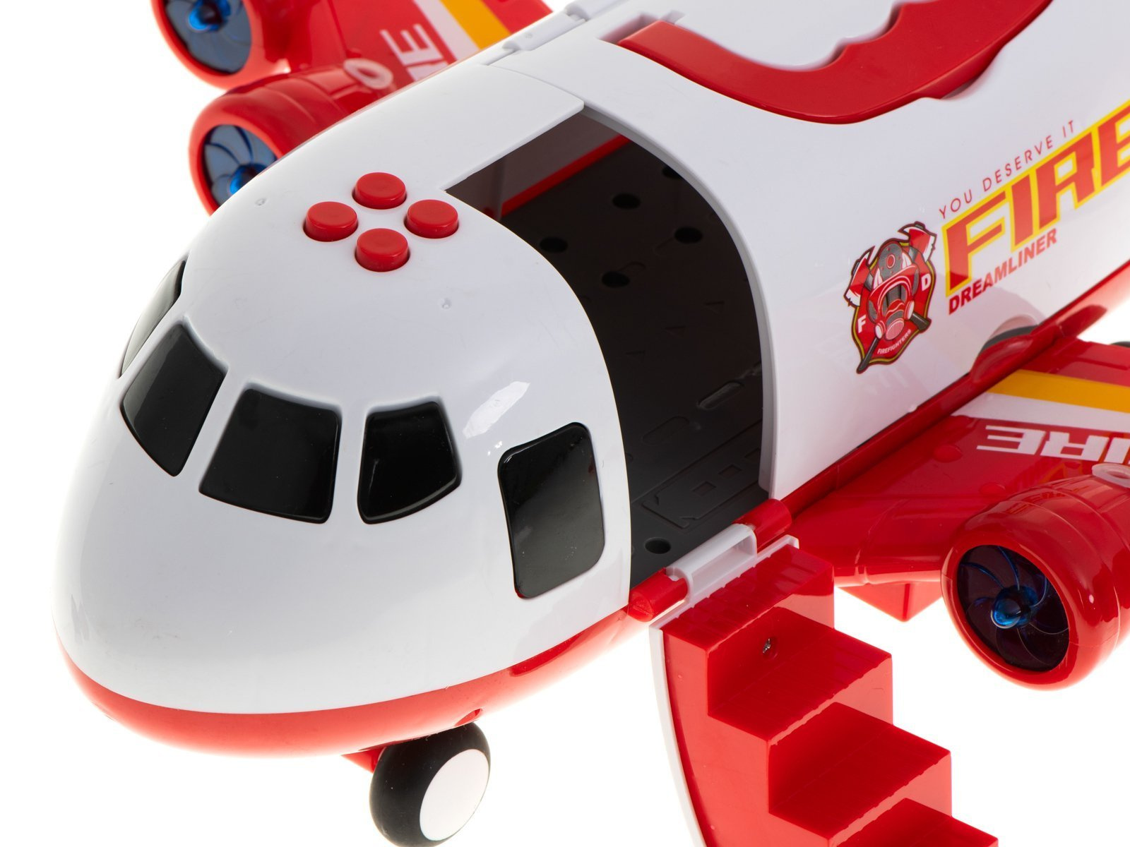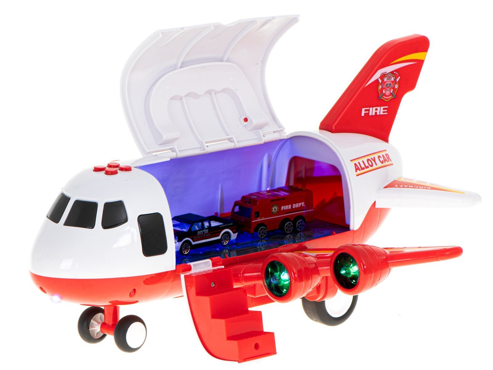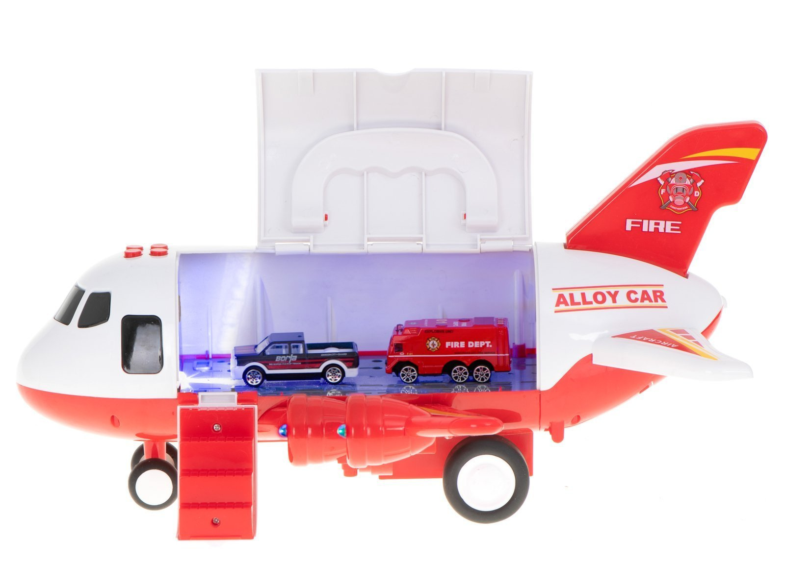 - Samolot-transporter z 2 samochodami straży pożarnej dla dzieci ucieszy każdego małego fana służb ratunkowych. Zabawka posiada efekty świetlne i dźwiękowe, które dodatkowo urozmaicą zabawę. Dla dzieci od lat 3.