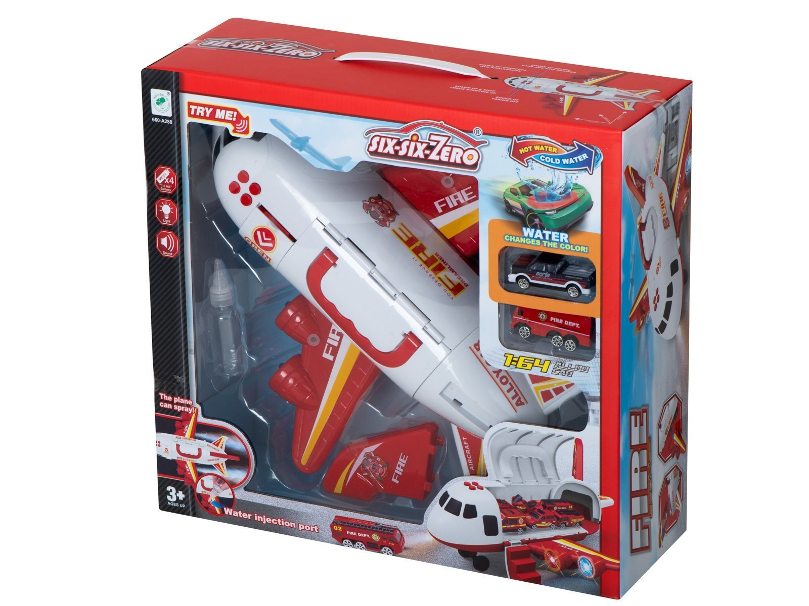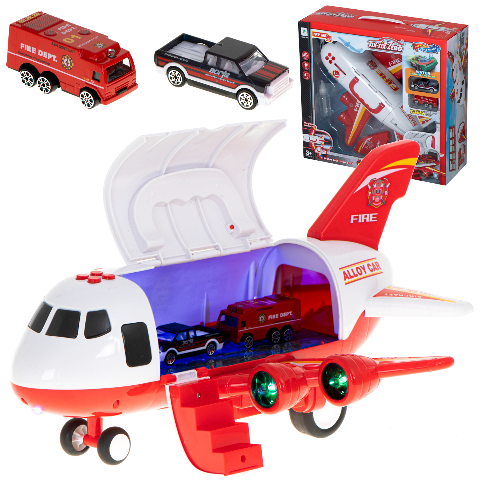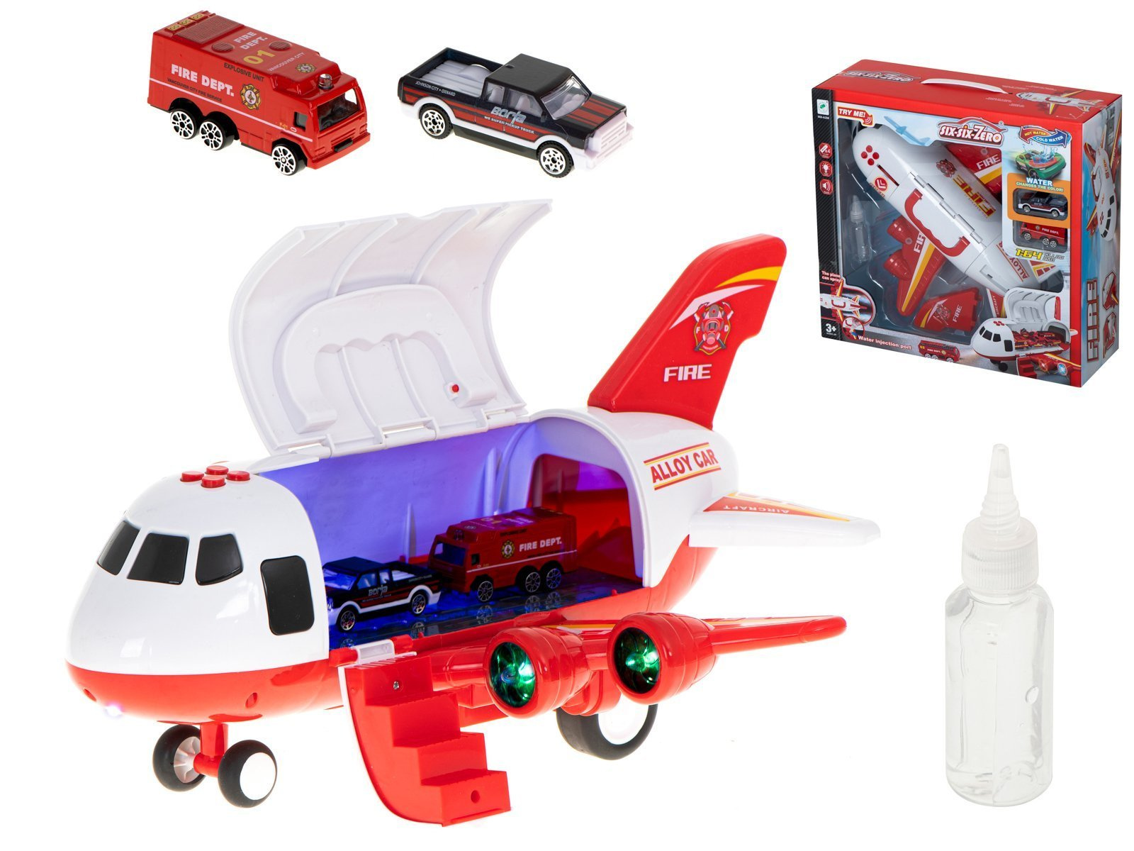 SAMOLOT TRANSPORTER TRYSKAJACY WODĄ Z SAMOCHODAMI STRAŻACKIMI DLA DZIECI