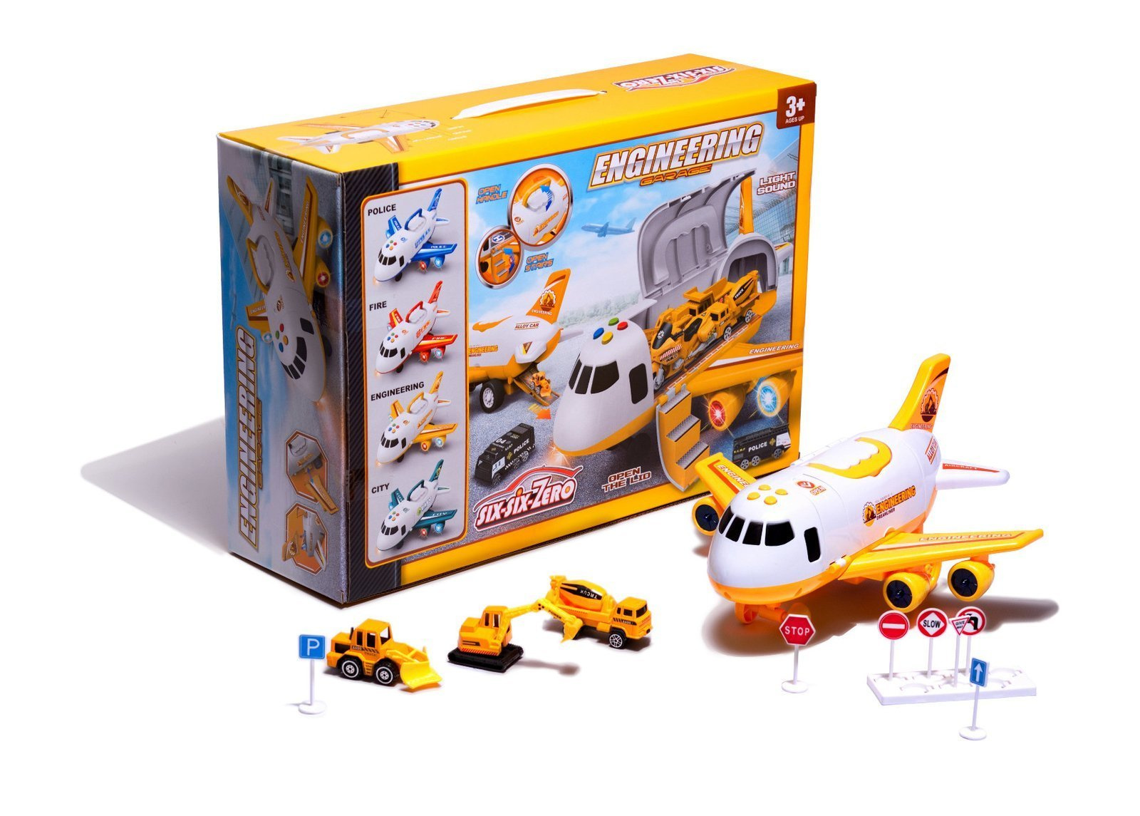 - Samolot-transporter z 3 samochodami maszyn budowlanych oraz kompletem znaków drogowych dla dzieci ucieszy każdego małego fana motoryzacji. Zabawka posiada efekty świetlne i dźwiękowe, które dodatkowo urozmaicą zabawę. Dla dzieci od lat 3.