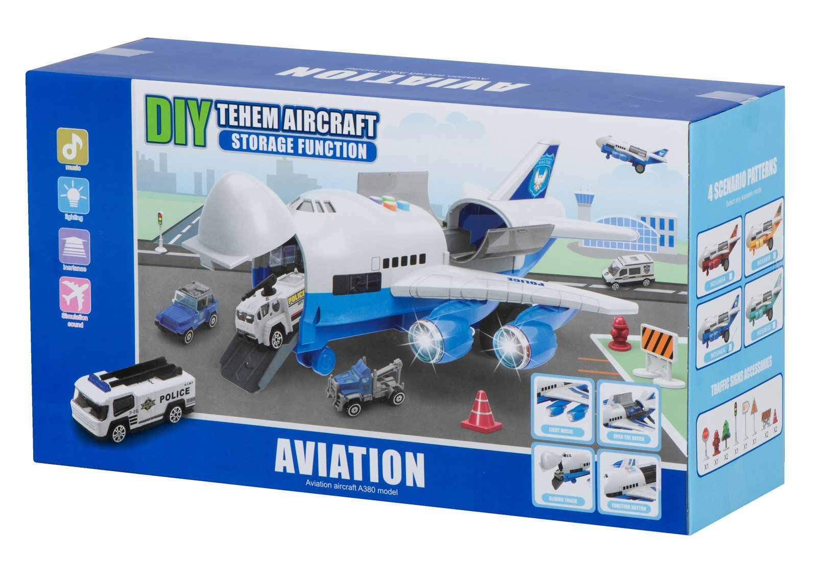 Duży otwierany samolot Transporter z zestawem samochodów policyjnych i znaków drogowych dla dzieci