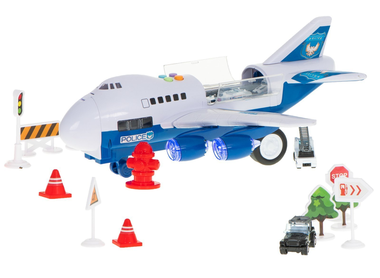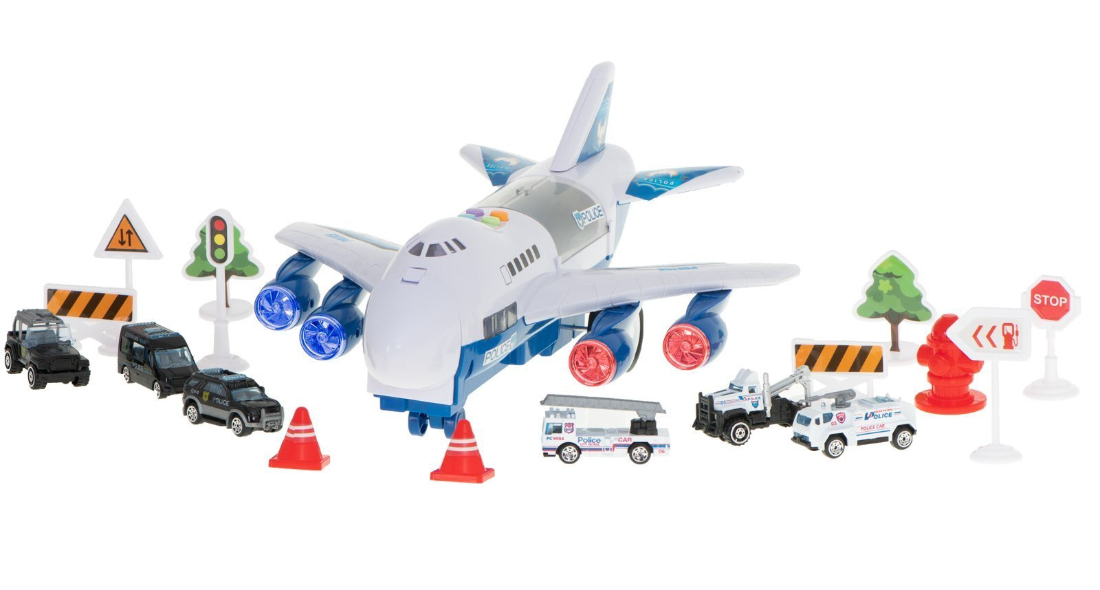 - Samolot-transporter z 6 samochodami policyjnymi oraz kompletem znaków drogowych dla dzieci ucieszy każdego małego fana służb ratunkowych. Zabawka posiada efekty świetlne LED, które dodatkowo urozmaicą zabawę. Dla dzieci od lat 3.