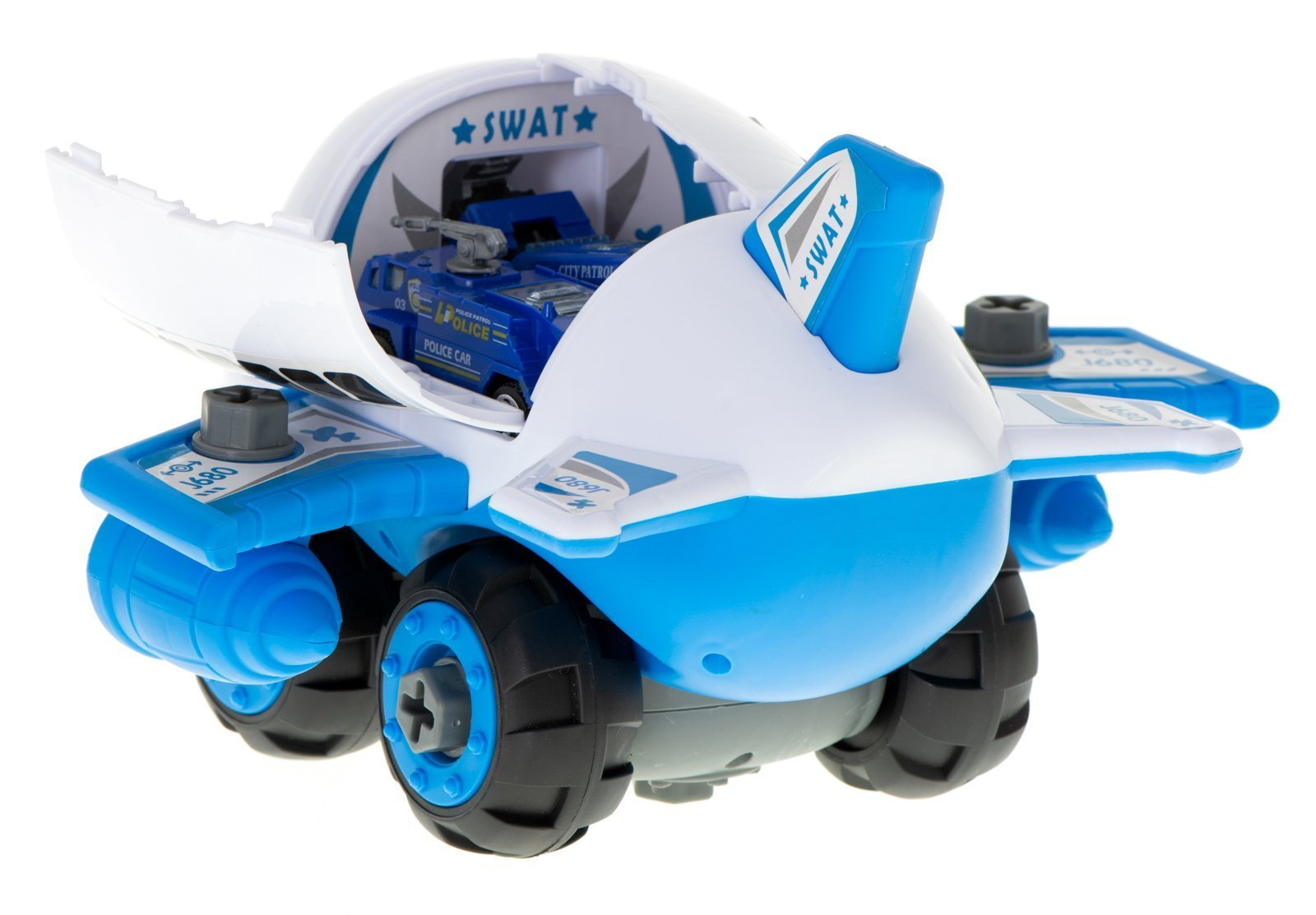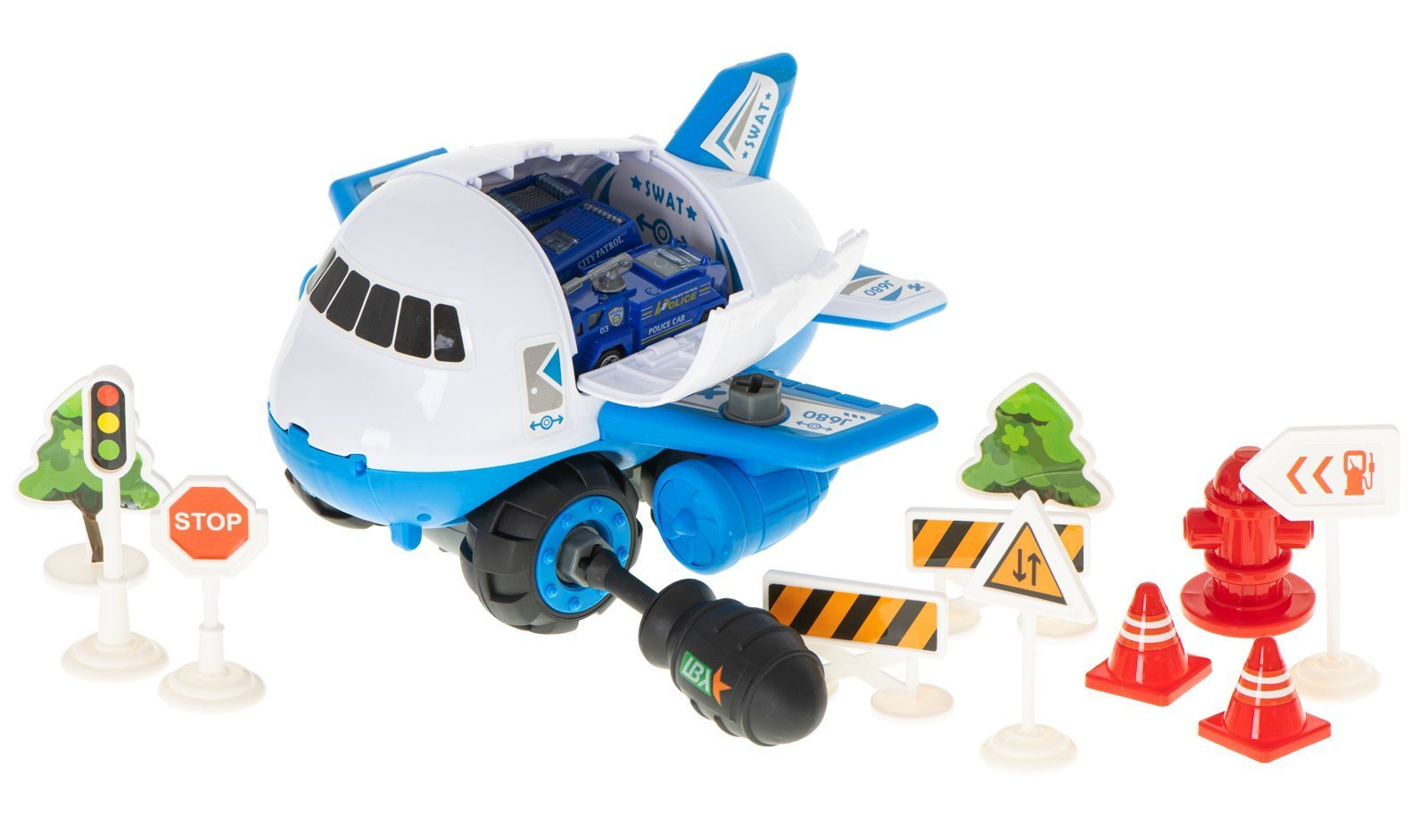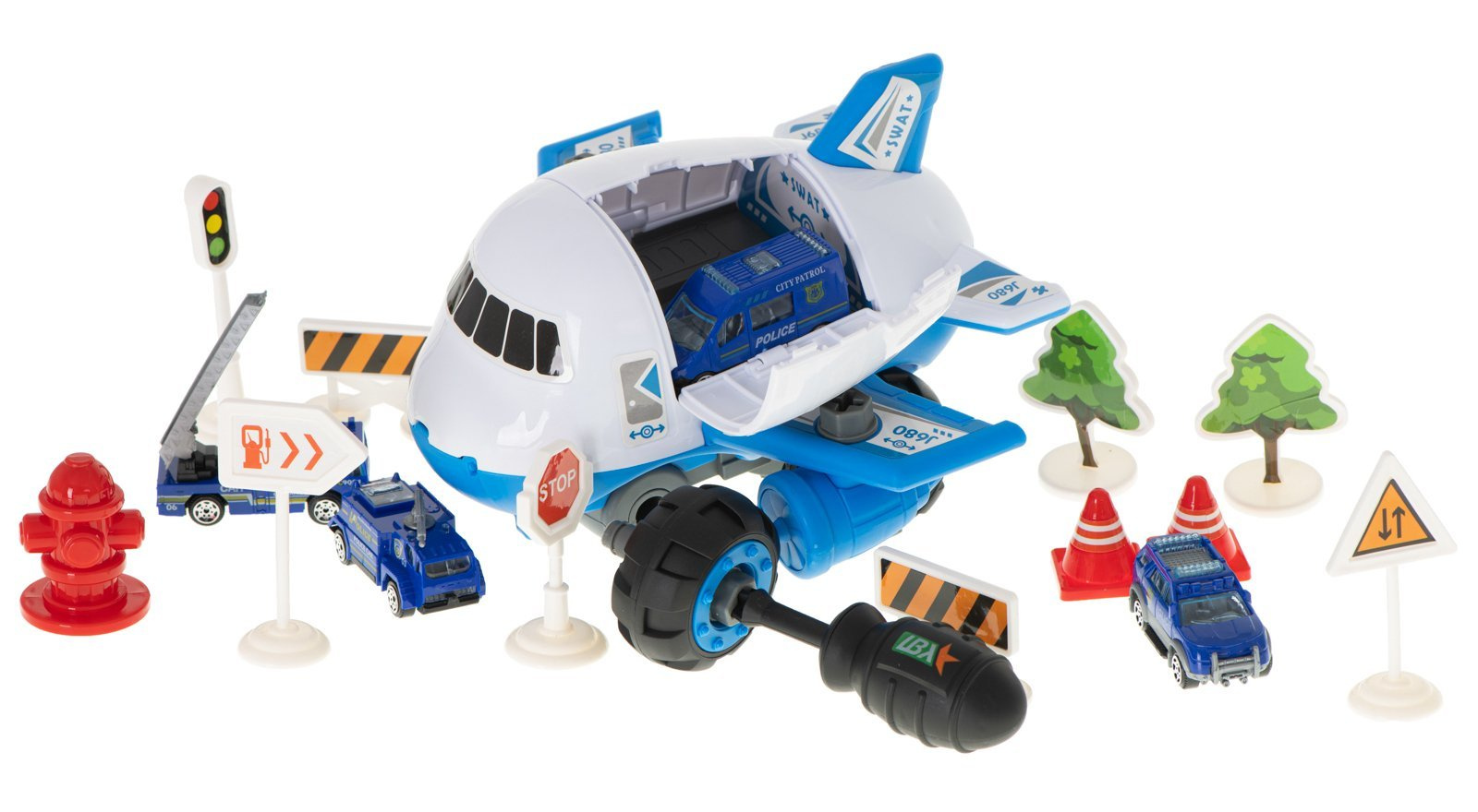 - Samolot-transporter z 4 samochodami oraz kompletem znaków drogowych dla dzieci ucieszy każdego małego fana lotnictwa. Dla dzieci od lat 3.