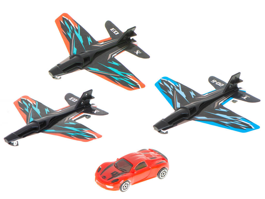 - Lekkie samoloty (3 szt), wykonane z lekkiego materiału - pianki, wystrzelone w powietrze, polecą naprawdę wysoko i daleko. Dodatkowo wyrzutnia samochodów - 1 samochodzik w zestawie