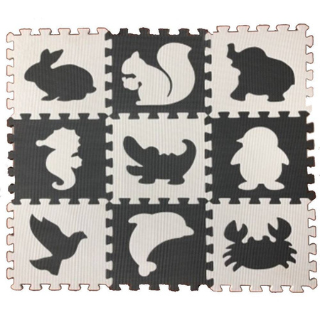 - Puzzle piankowe, które po ułożeniu tworzą matę do zabawy. Posiadają wyciągane kształty przedstawiające zwierzęta. Kolor ecru-czarny.
