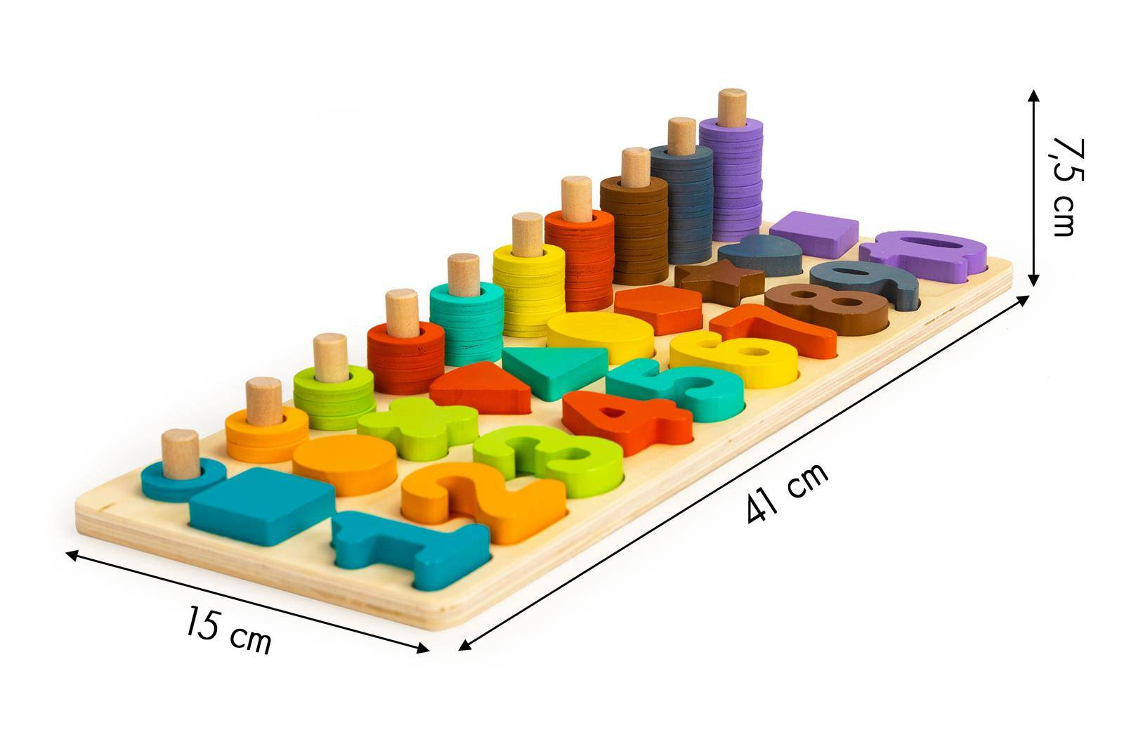 - Zabawka edukacyjna dla dzieci. Wspiera w nauce kolorów, kształtów i liczenia. Składa się z liczydła, układanki i sortera. Wykonane z drewna. Dla dzieci powyżej 3 roku życia.