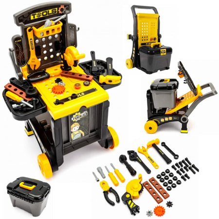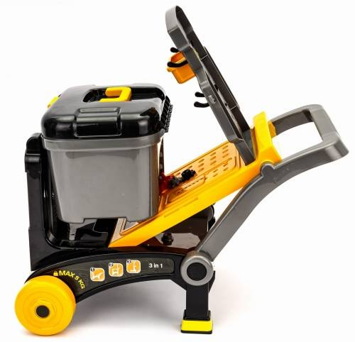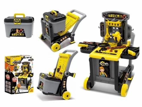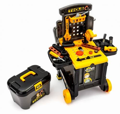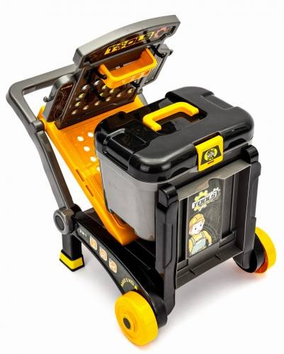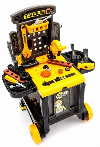 Przy użyciu warsztatu z narzędziami w pokoju Twojego dziecka może powstać kreatywny kącik zabaw. Przedstawiony wózek jest łatwy w przemieszczaniu, dzięki dołączonym kółkom. Zestaw można transportować na dwa sposoby, w pierwszym z nich wystarczy przechylić wózek i położyć na nim walizkę. W drugim zaś wkładamy walizkę do środka, dzięki czemu nie wypadnie ona podczas poruszania się. Warsztat majsterkowicza posiada blat oraz półeczki, dzięki czemu każdy przedmiot może znaleźć swoje miejsce, a po skończonej zabawie narzędzia znajdą swoje miejsce w walizce. Zestaw narzędzi umożliwi poznanie pracy w warsztacie, rozwinie wyobraźnie i kreatywność.DANE TECHNICZNE