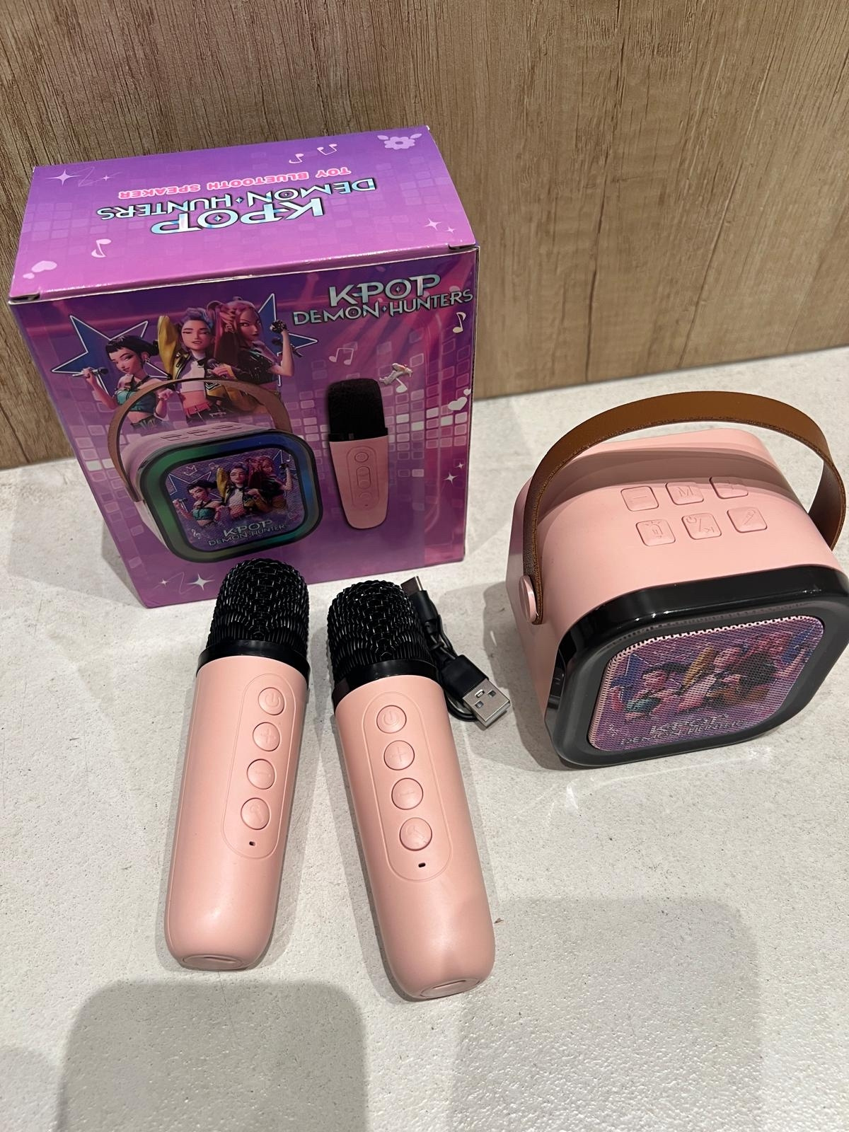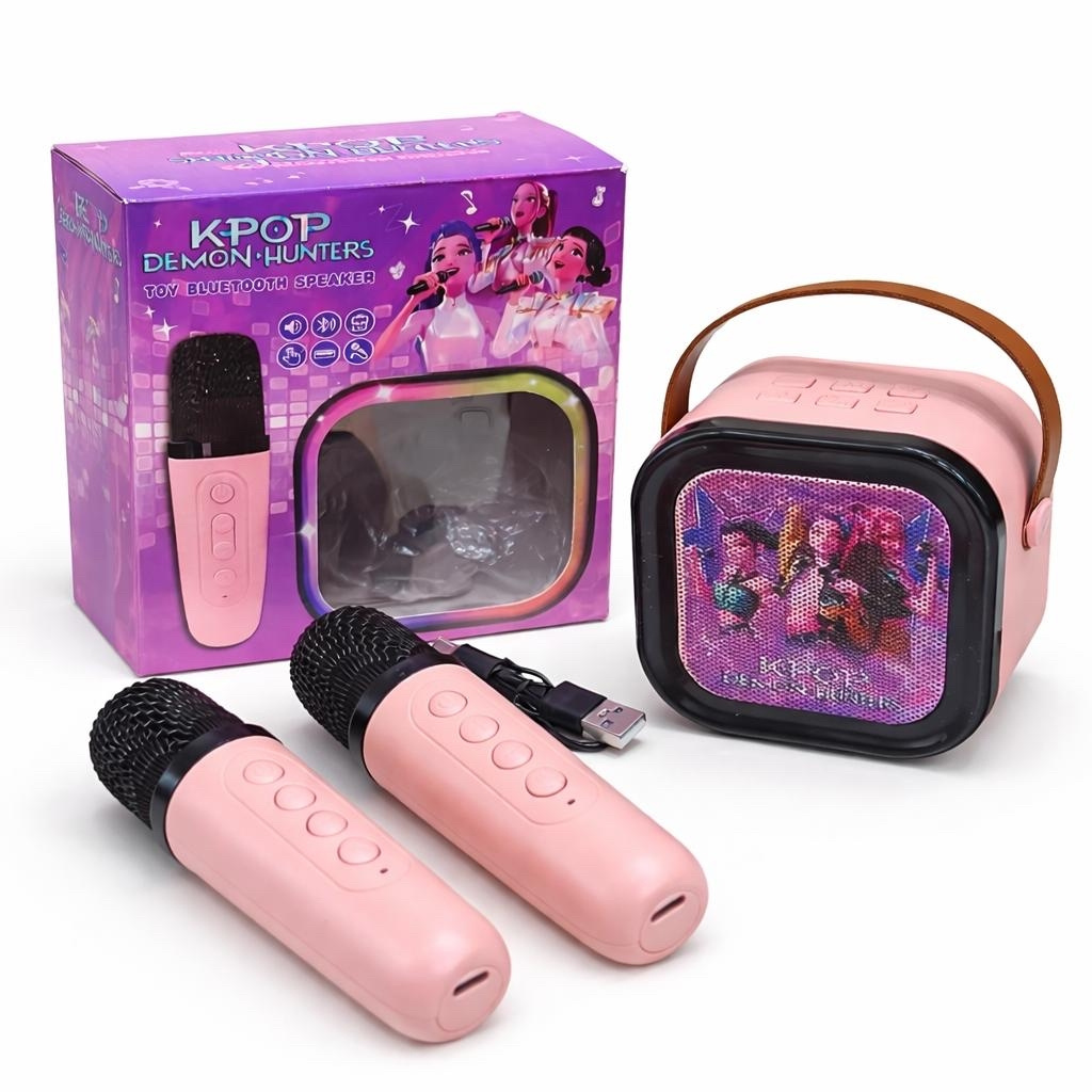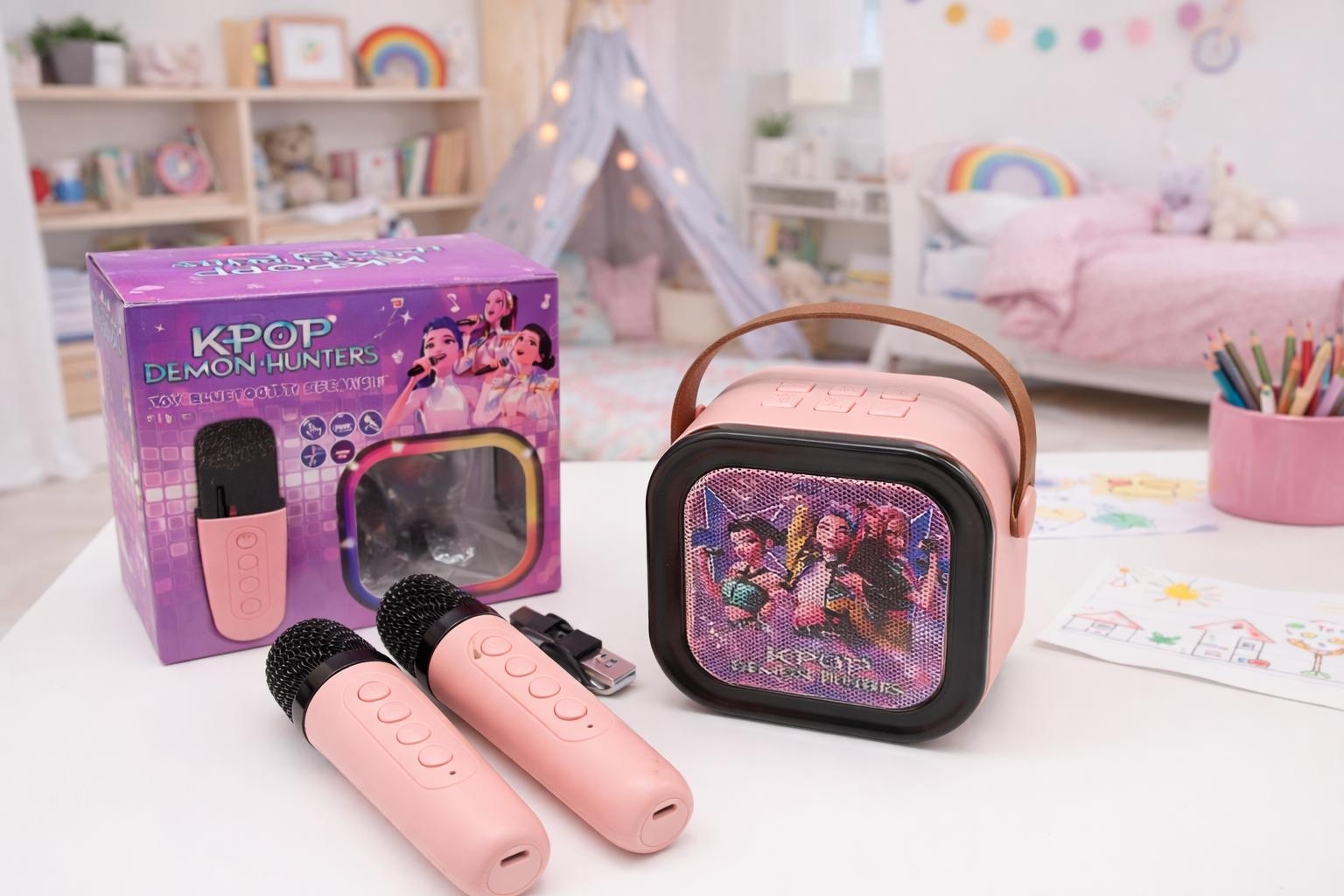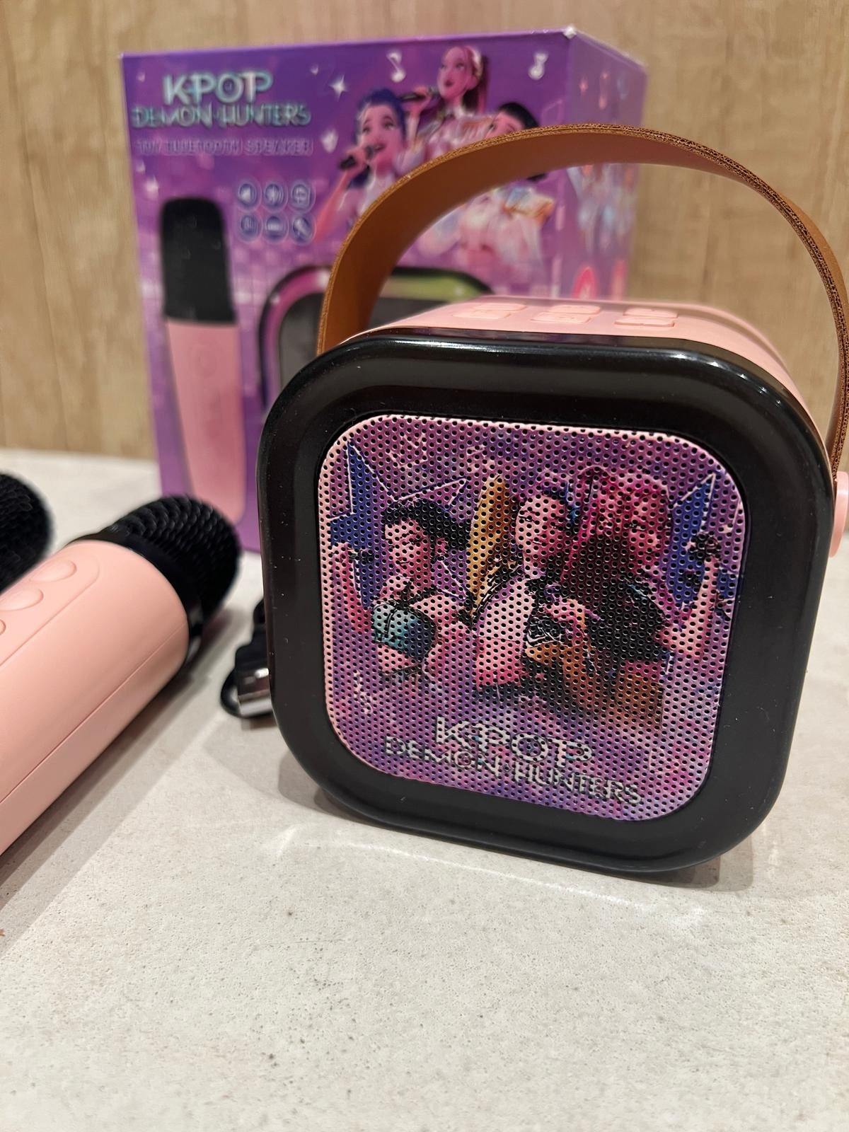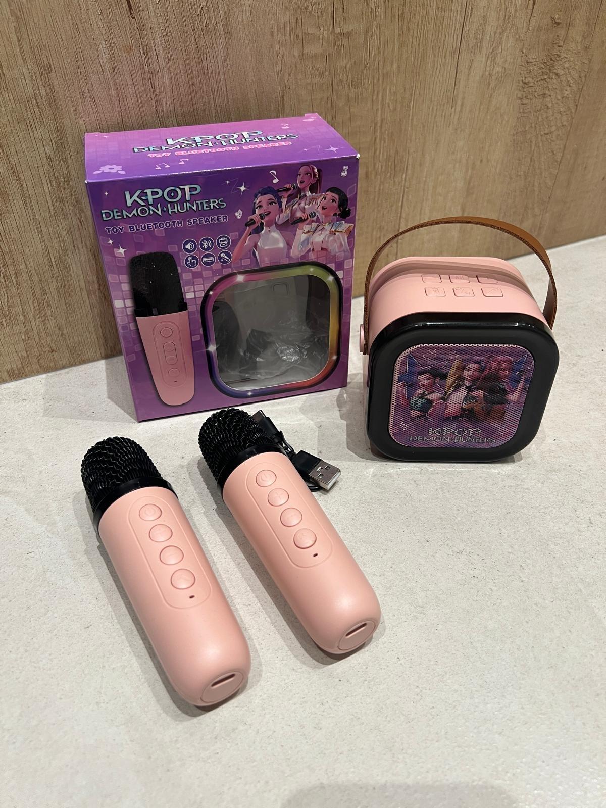 - Zestaw do karaoke dla dzieci zawierający głośnik oraz dwa mikrofony z motywem bohaterek bajki K-popowe łowczynie demonów. Idealny zestaw na prezent!