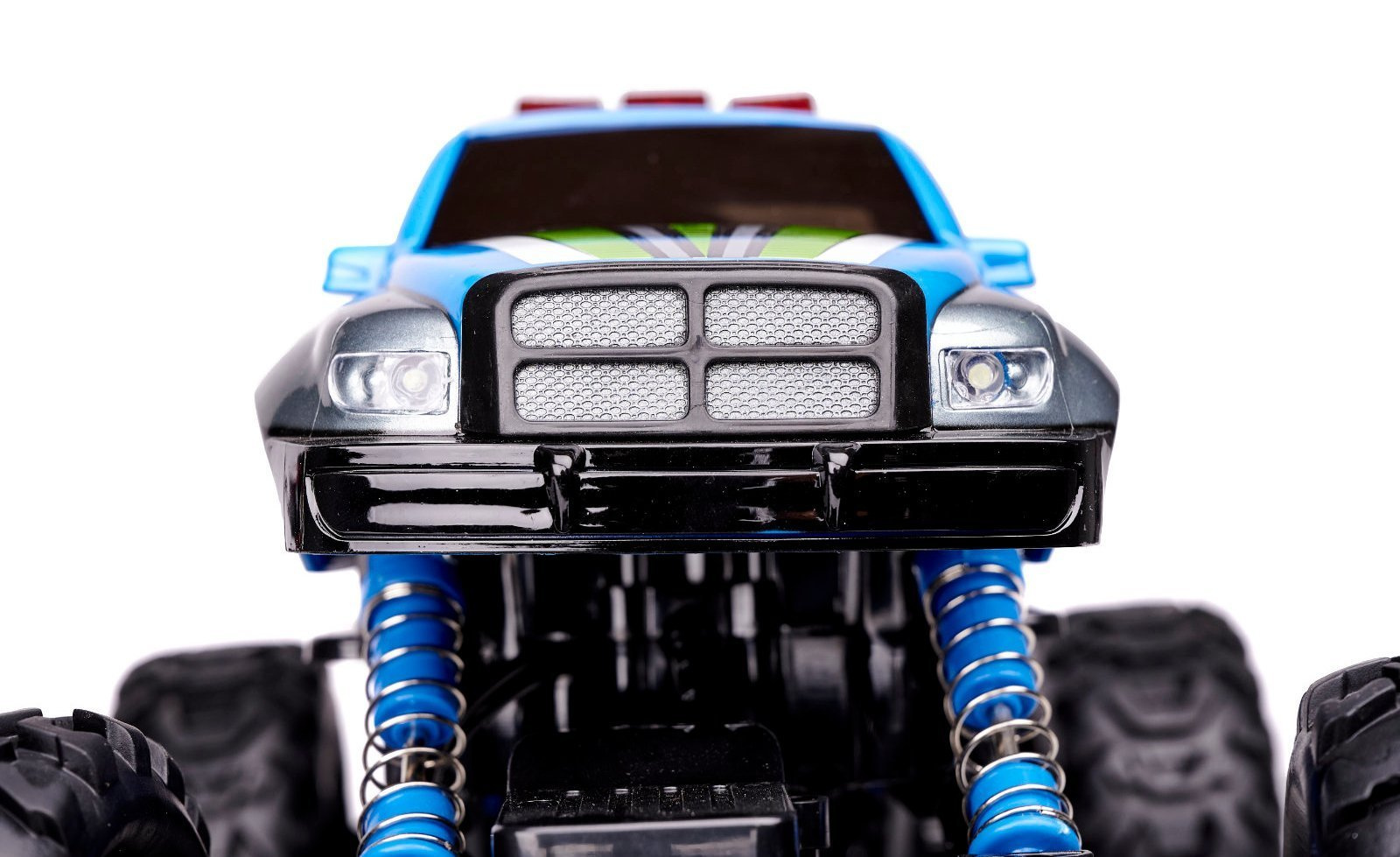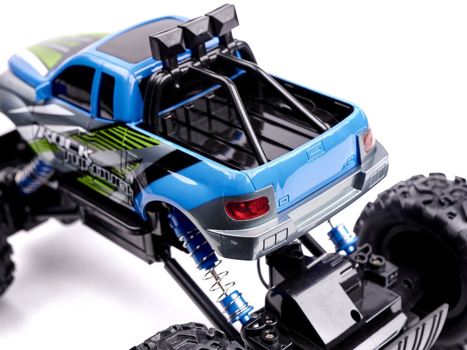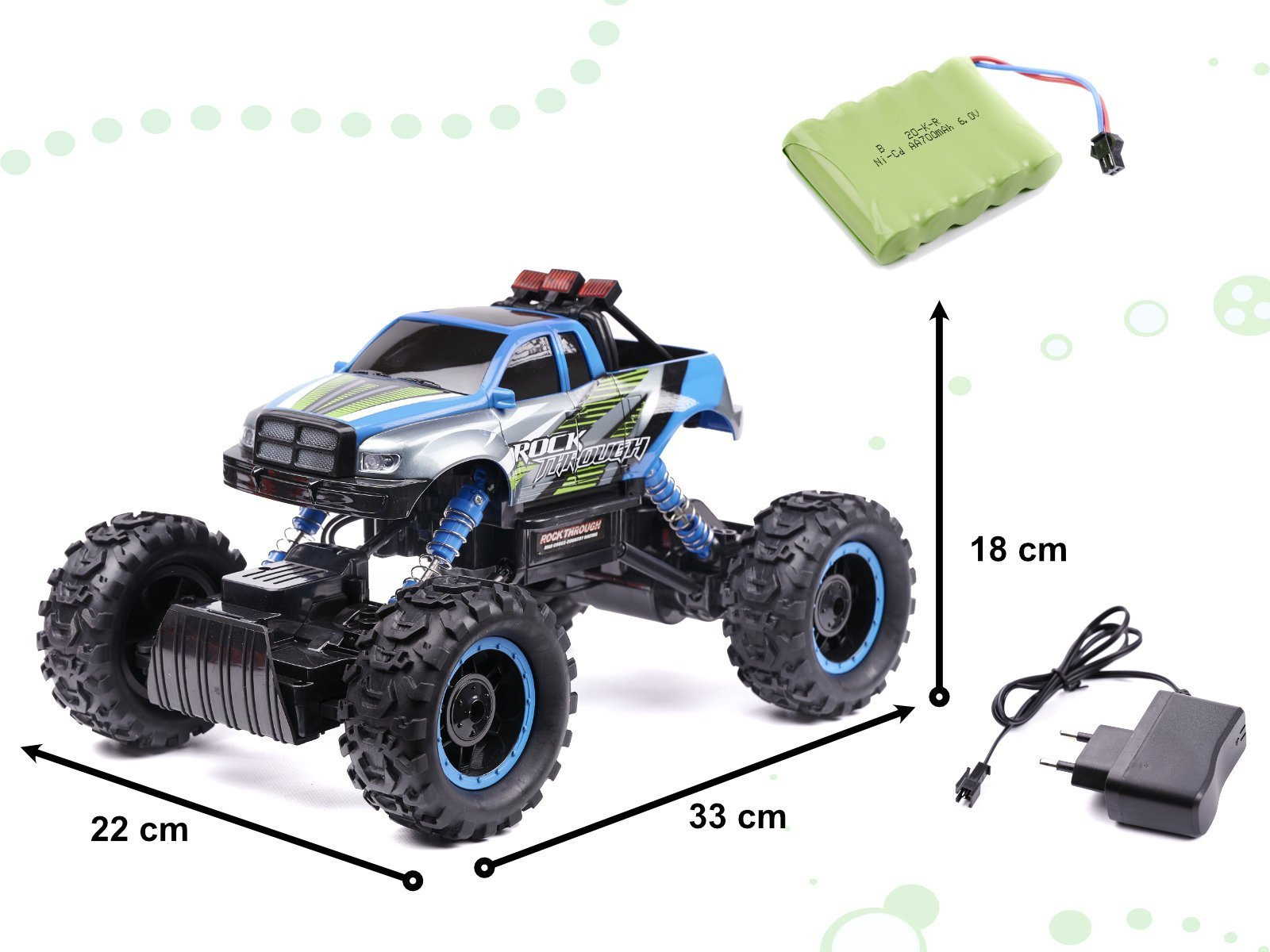 - Niebieski, zdalnie sterowany Rock Crawler to prawdziwy pogromca terenu! Dzięki swoim dużym wymiarom, jest w stanie pokonać każdą przeszkodę stojącą mu na drodze. Zabawka przeznaczona dla dzieci od lat 8.