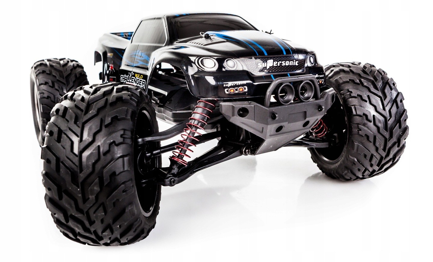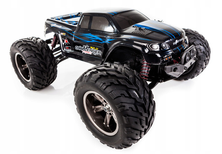 - Niebieski, duży samochód terenowy Monster Truck pokona każdą nawierzchnię dzięki swoim grubym oponom, a jego zawrotna prędkość 42 km/h prześcignie większość samochodów zdalnie sterowanych dostępnych na rynku. Zabawka przeznaczona dla dzieci od lat 5.